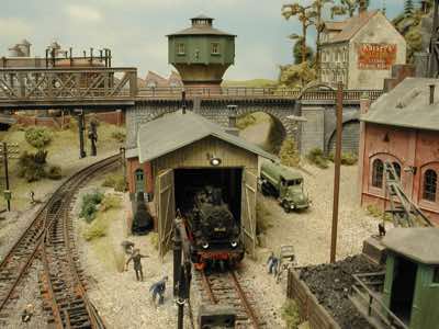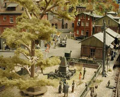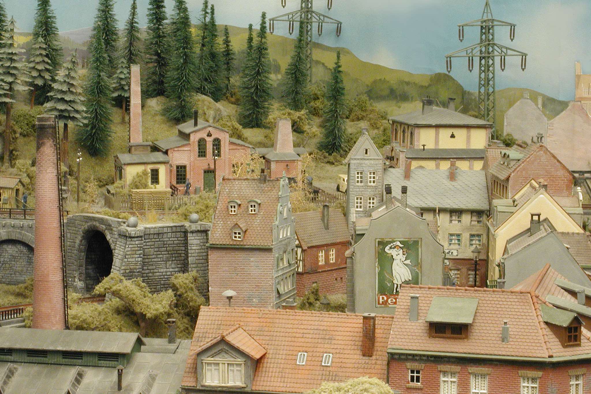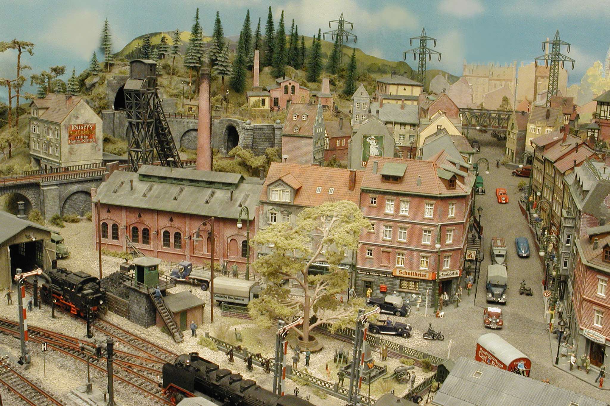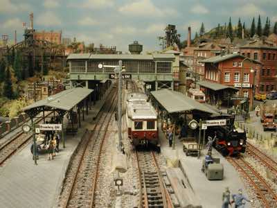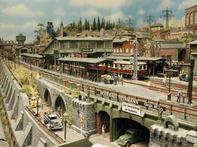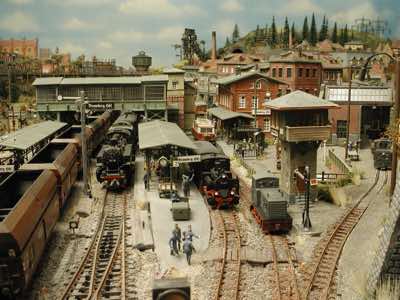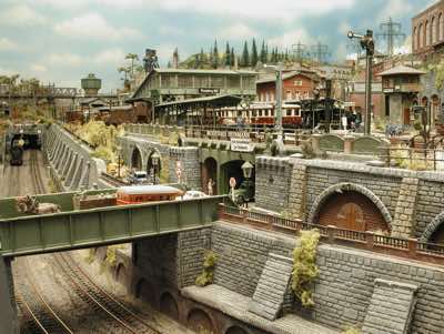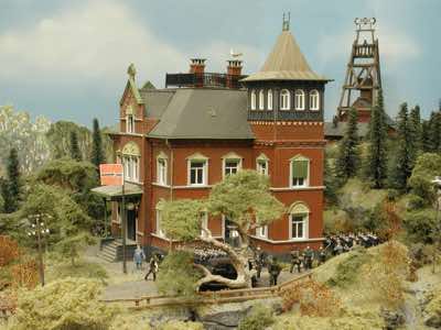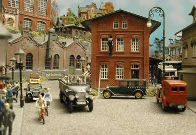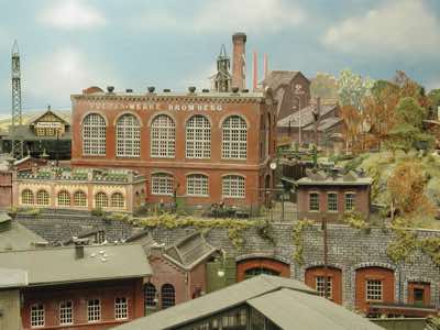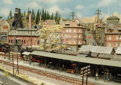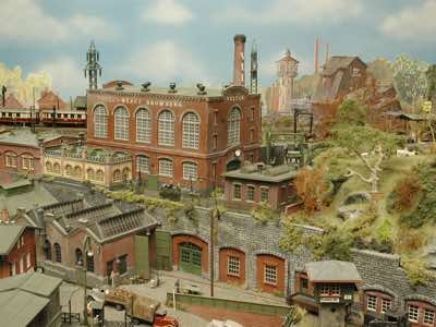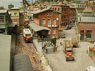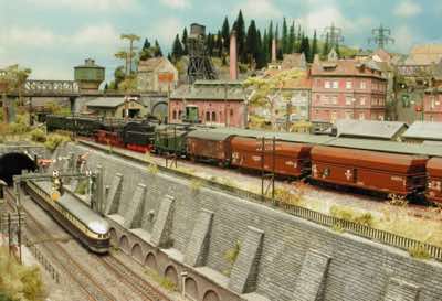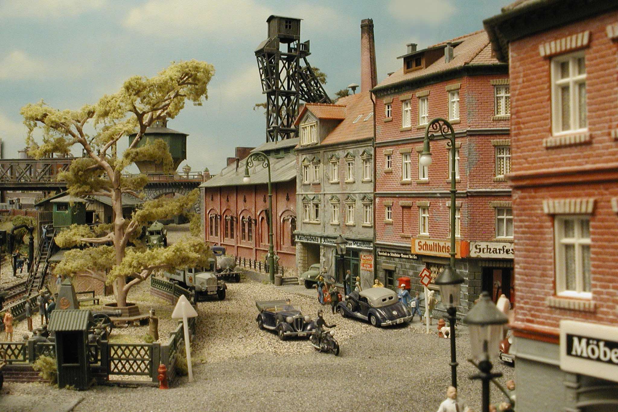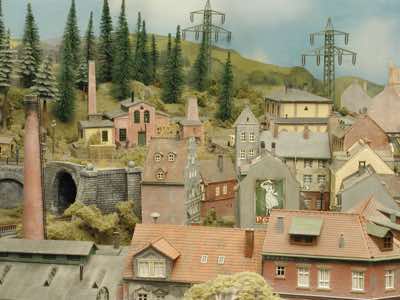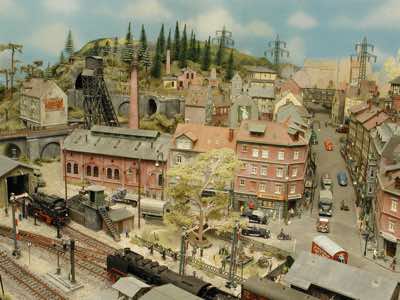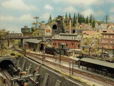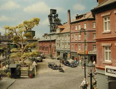 In vielen Fachzeitschriften und Anlagen-Reports holte ich mir Anregungen und Ratschläge für den Aufbau meiner Anlage. Grosse Vorbilder sind und waren für mich die "alten Hasen" wie Bernd Schmid mit den vielen interessanten Vorlagen, die meist in Märklin-Magazinen erschienen sind. Die fantastische Anlage von Wolfgang Borgas sowie die Großstadt-Anlage von Eberhard Schulze, welche beide in Miba Reports vorgestellt wurden, inspirierten mich ebenso wie die Skizzen und Zeichnungen von "Pit-Peg", die eine wahre Fundgrube darstellen und meine Phantasie anregten. Sehr reizvoll war für mich auch, durch Kombinieren und Abwandeln bekannter Bausätze und Bauteile, individuelle Gebäude zu schaffen, die so nicht im Handel zu erwerben sind. Viele Gebäude auf meiner Anlage wurden nach diesem Prinzip erstellt. Mit etwas Farbe - an den richtigen Stellen und mit der richtigen Technik aufgetragen -, lässt sich ja ohne sonderlich grossen Aufwand die realistische Wirkung von Gebäuden erheblich steigern. Viele Ausstattungs- und Kleinteile stammen übrigens auch von englischen und amerikanischen Herstellern. So sind bei den Automodellen neben den Produkten der bekannten Marken wie Marken wie Brekina, Wiking, Roskopf und Busch auch Modelle, die aus Bausätzen von Woodland-Scenics und Jordan entstanden sind, zu sehen. Der Zusammenbau dieser filigranen Weissgussmetall- oder Polystyrol-Bausätze ist oft eine recht anspruchsvolle Angelegenheit. Die Landschaft wird von den verschiedenen Industriebauten und Zechenanlagen mit Fördertürmen geprägt.