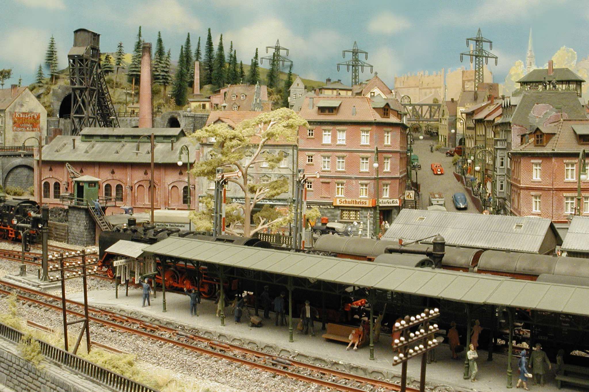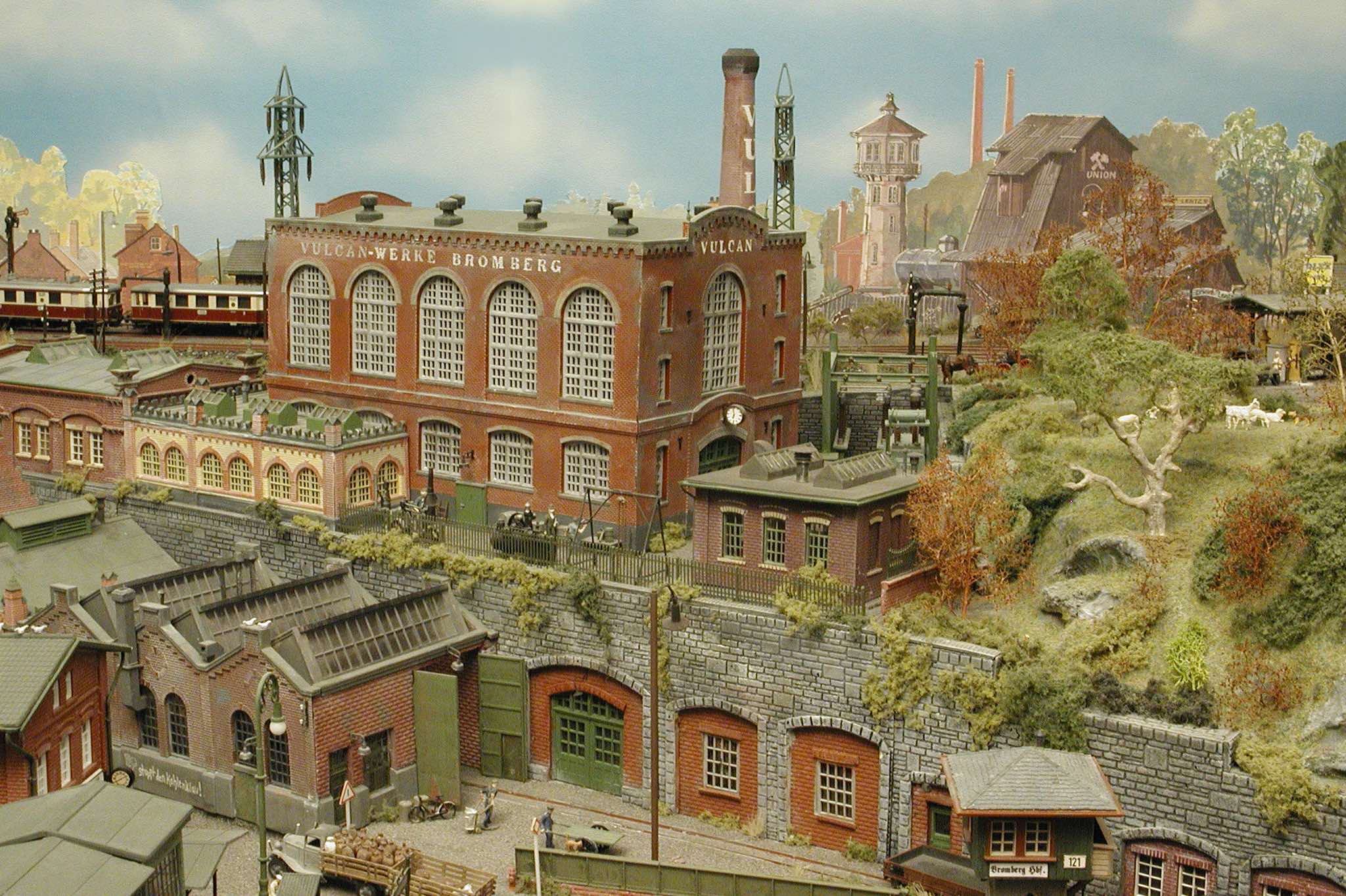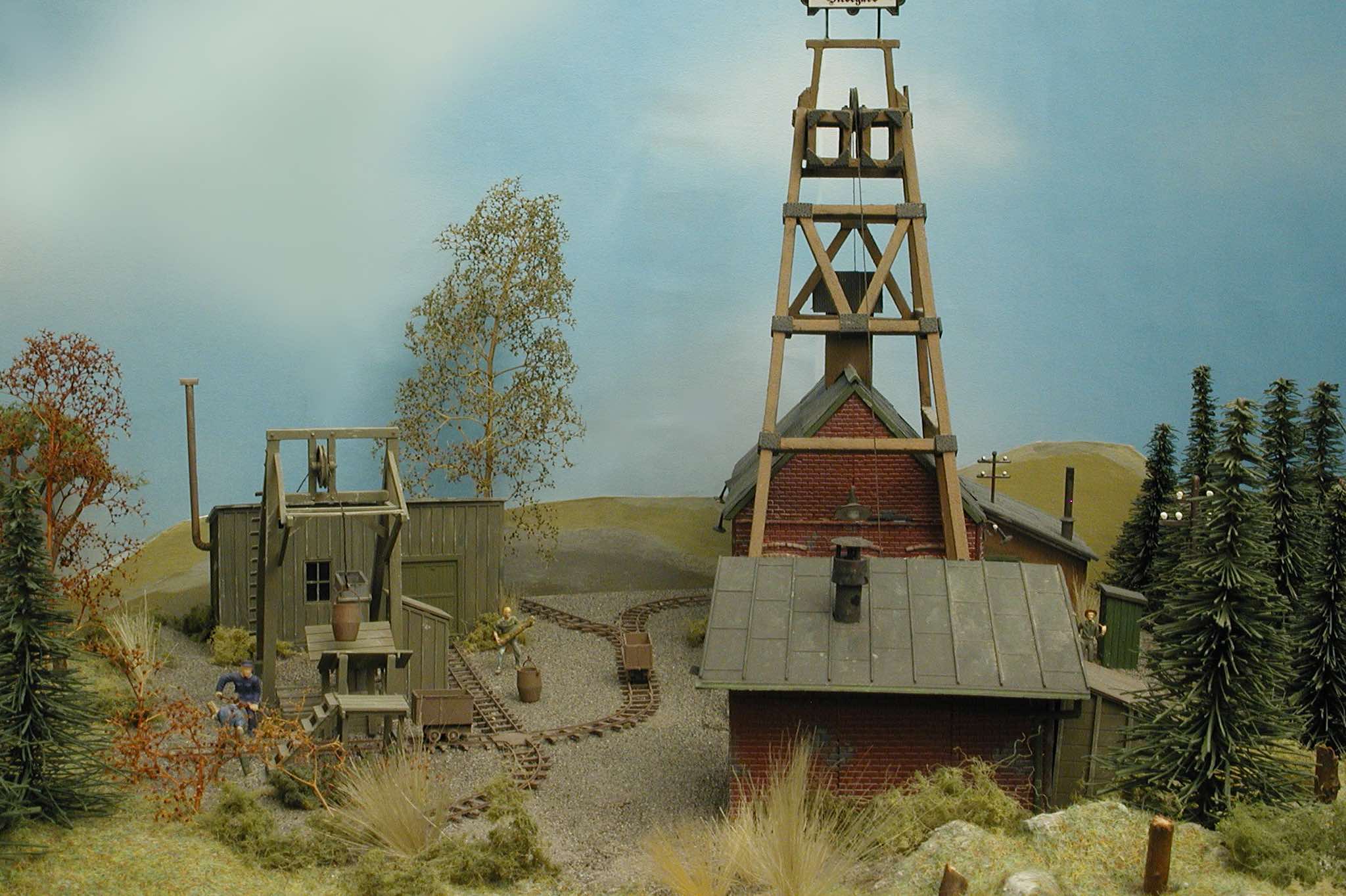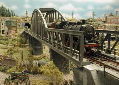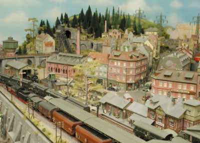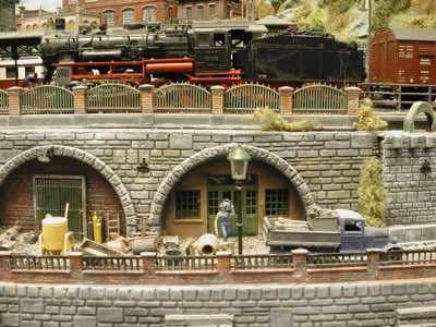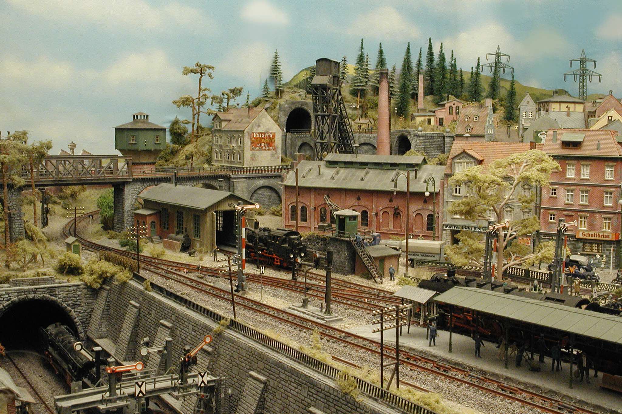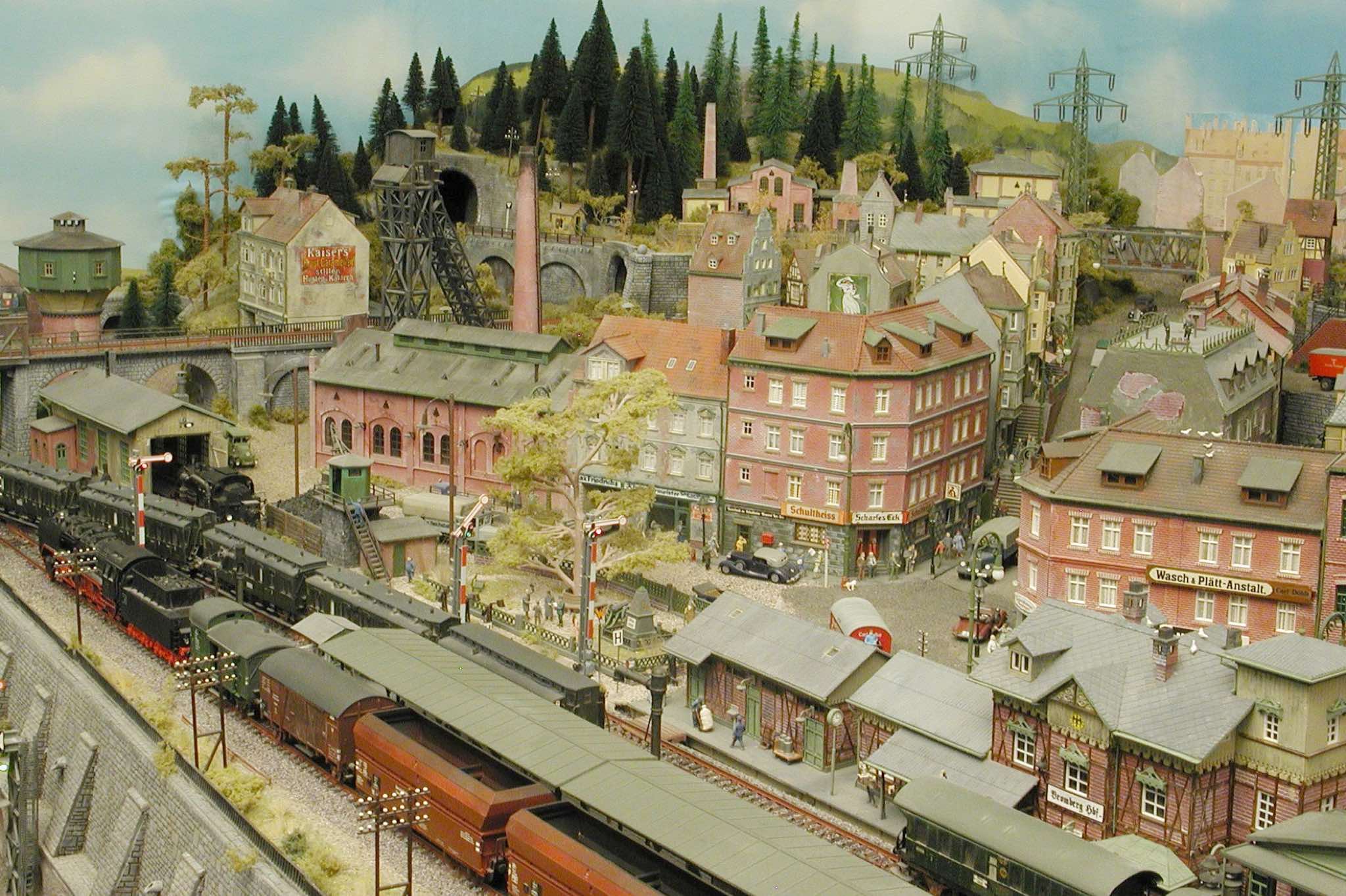 In vielen Fachzeitschriften und Anlagen-Reports holte ich mir Anregungen und Ratschläge für den Aufbau meiner Anlage. Grosse Vorbilder sind und waren für mich die "alten Hasen" wie Bernd Schmid mit den vielen interessanten Vorlagen, die meist in Märklin-Magazinen erschienen sind. Die fantastische Anlage von Wolfgang Borgas sowie die Großstadt-Anlage von Eberhard Schulze, welche beide in Miba Reports vorgestellt wurden, inspirierten mich ebenso wie die Skizzen und Zeichnungen von "Pit-Peg", die eine wahre Fundgrube darstellen und meine Phantasie anregten. Sehr reizvoll war für mich auch, durch Kombinieren und Abwandeln bekannter Bausätze und Bauteile, individuelle Gebäude zu schaffen, die so nicht im Handel zu erwerben sind. Viele Gebäude auf meiner Anlage wurden nach diesem Prinzip erstellt. Mit etwas Farbe - an den richtigen Stellen und mit der richtigen Technik aufgetragen -, lässt sich ja ohne sonderlich grossen Aufwand die realistische Wirkung von Gebäuden erheblich steigern. Viele Ausstattungs- und Kleinteile stammen übrigens auch von englischen und amerikanischen Herstellern. So sind bei den Automodellen neben den Produkten der bekannten Marken wie Marken wie Brekina, Wiking, Roskopf und Busch auch Modelle, die aus Bausätzen von Woodland-Scenics und Jordan entstanden sind, zu sehen. Der Zusammenbau dieser filigranen Weissgussmetall- oder Polystyrol-Bausätze ist oft eine recht anspruchsvolle Angelegenheit. Die Landschaft wird von den verschiedenen Industriebauten und Zechenanlagen mit Fördertürmen geprägt.
