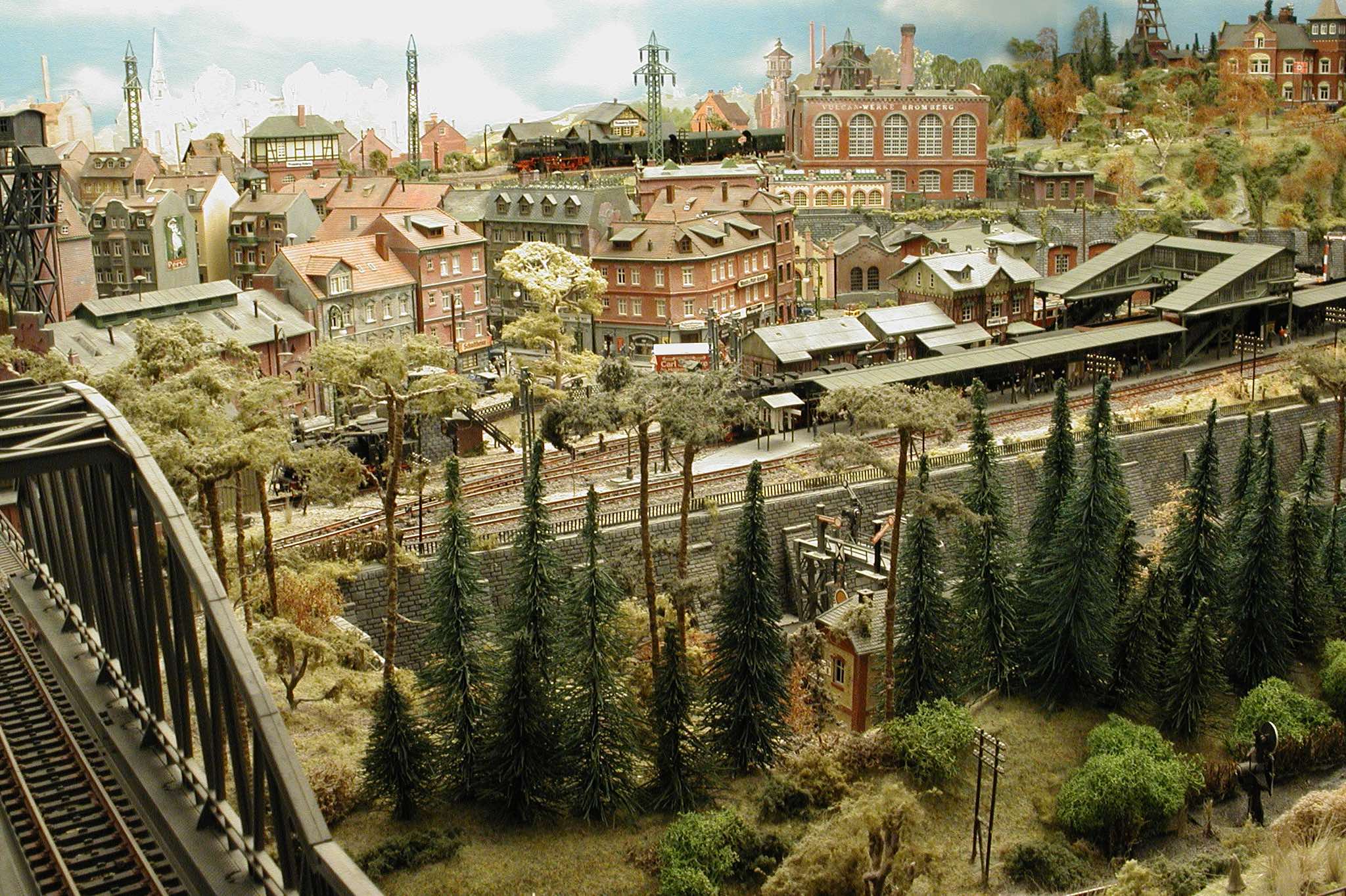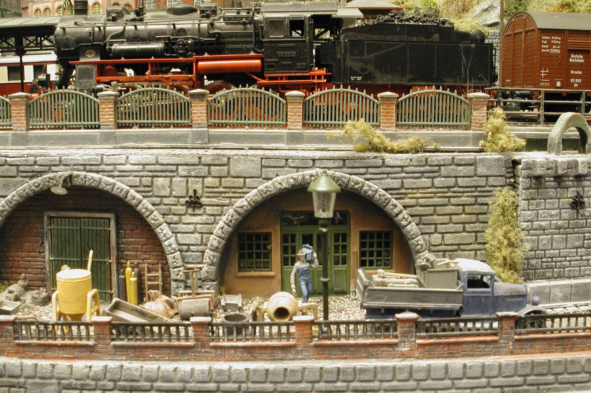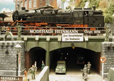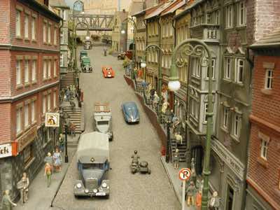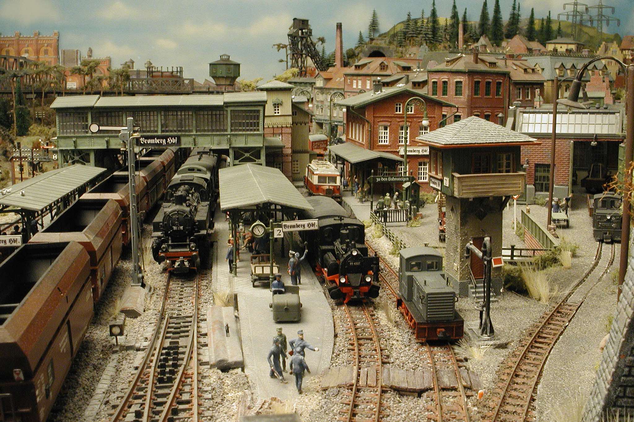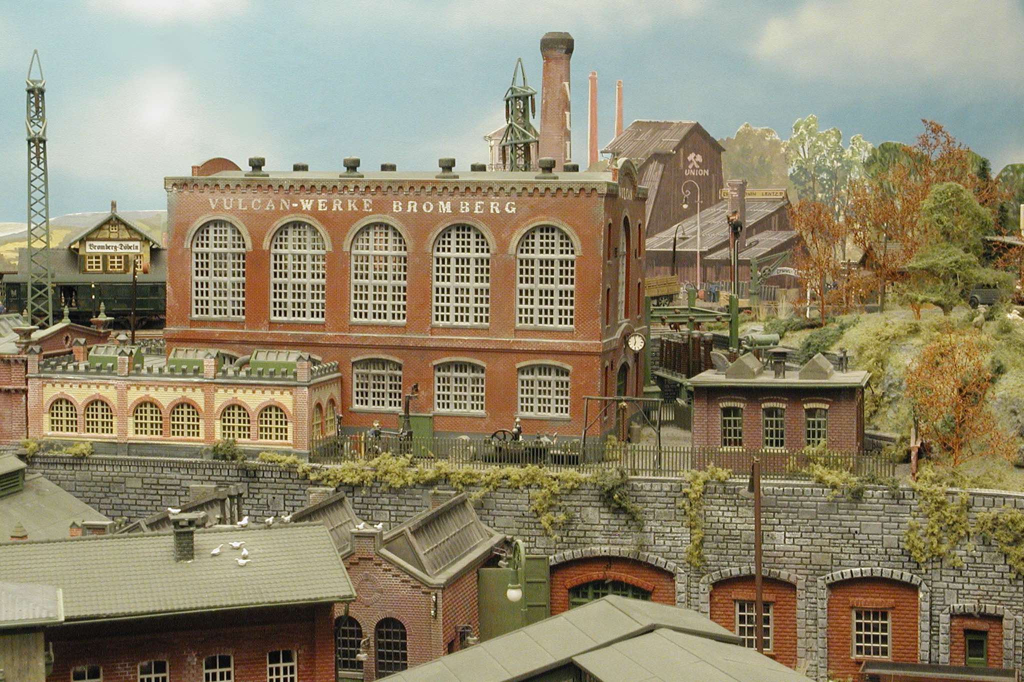 In vielen Fachzeitschriften und Anlagen-Reports holte ich mir Anregungen und Ratschläge für den Aufbau meiner Anlage. Grosse Vorbilder sind und waren für mich die "alten Hasen" wie Bernd Schmid mit den vielen interessanten Vorlagen, die meist in Märklin-Magazinen erschienen sind. Die fantastische Anlage von Wolfgang Borgas sowie die Großstadt-Anlage von Eberhard Schulze, welche beide in Miba Reports vorgestellt wurden, inspirierten mich ebenso wie die Skizzen und Zeichnungen von "Pit-Peg", die eine wahre Fundgrube darstellen und meine Phantasie anregten. Sehr reizvoll war für mich auch, durch Kombinieren und Abwandeln bekannter Bausätze und Bauteile, individuelle Gebäude zu schaffen, die so nicht im Handel zu erwerben sind. Viele Gebäude auf meiner Anlage wurden nach diesem Prinzip erstellt. Mit etwas Farbe - an den richtigen Stellen und mit der richtigen Technik aufgetragen -, lässt sich ja ohne sonderlich grossen Aufwand die realistische Wirkung von Gebäuden erheblich steigern. Viele Ausstattungs- und Kleinteile stammen übrigens auch von englischen und amerikanischen Herstellern. So sind bei den Automodellen neben den Produkten der bekannten Marken wie Marken wie Brekina, Wiking, Roskopf und Busch auch Modelle, die aus Bausätzen von Woodland-Scenics und Jordan entstanden sind, zu sehen. Der Zusammenbau dieser filigranen Weissgussmetall- oder Polystyrol-Bausätze ist oft eine recht anspruchsvolle Angelegenheit. Die Landschaft wird von den verschiedenen Industriebauten und Zechenanlagen mit Fördertürmen geprägt.
