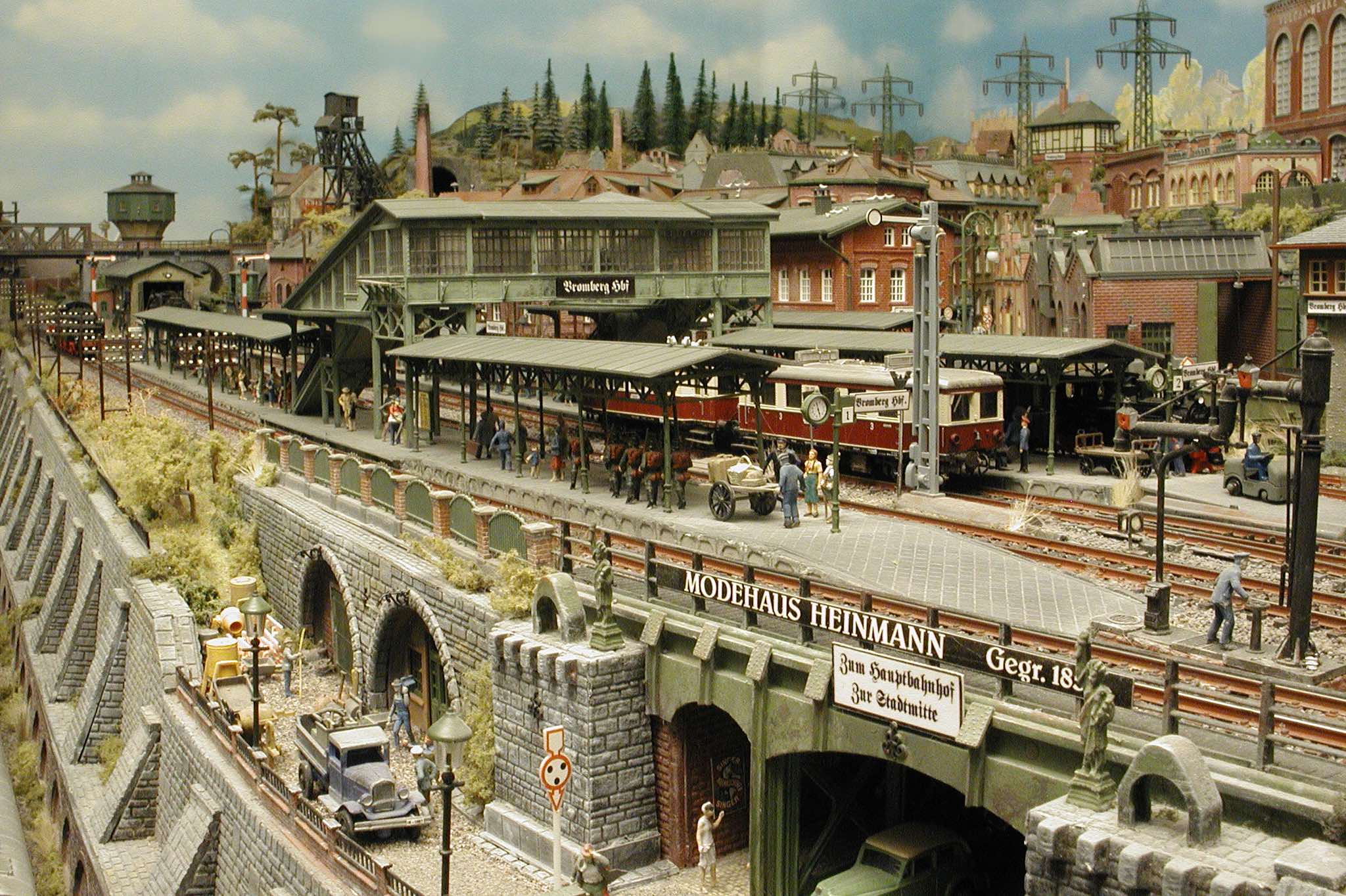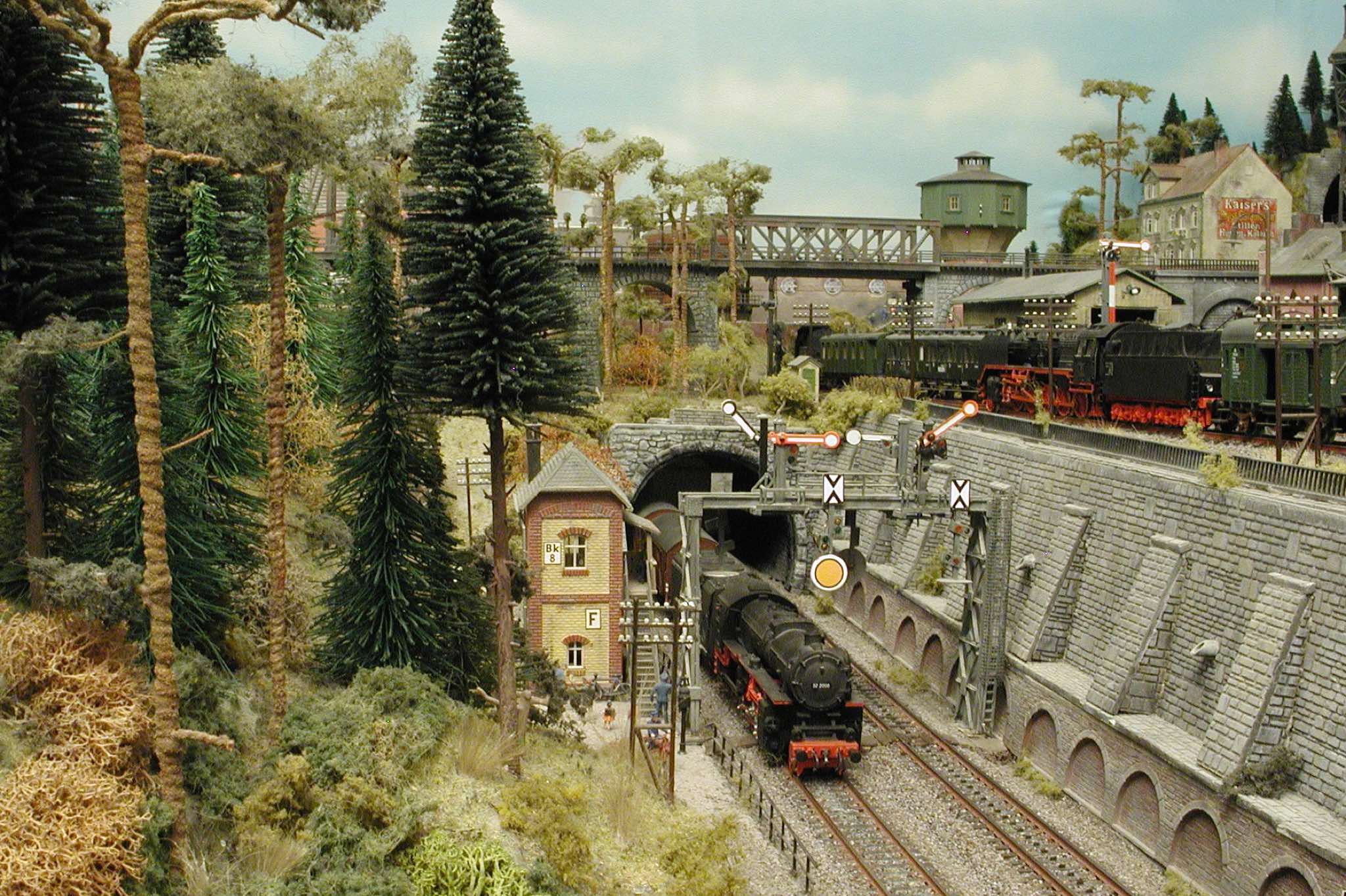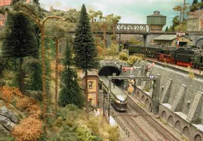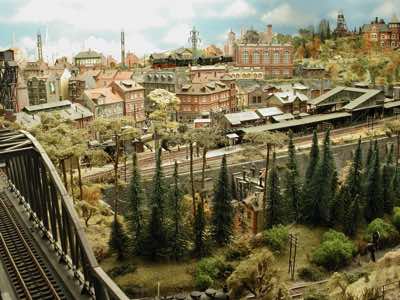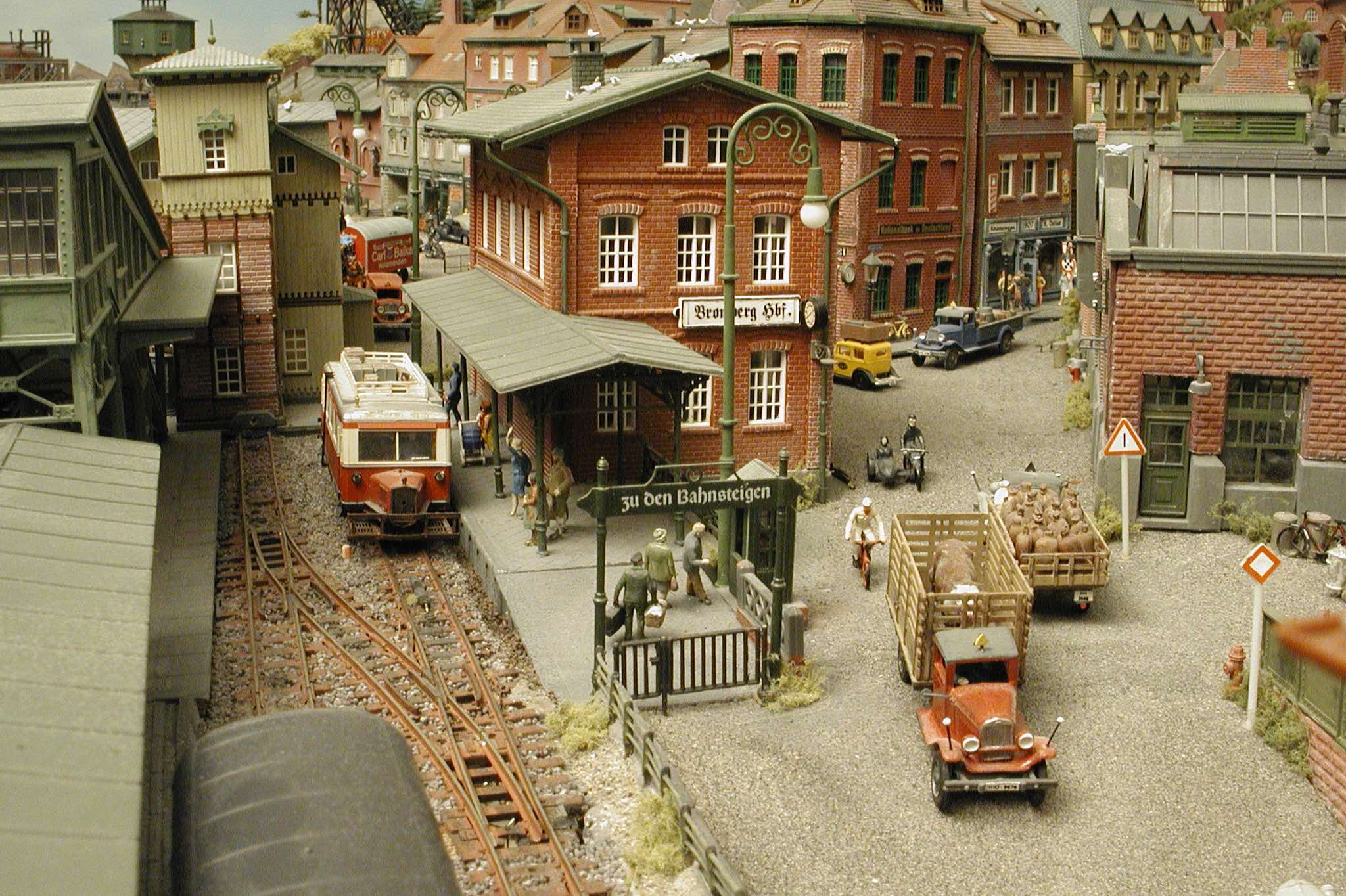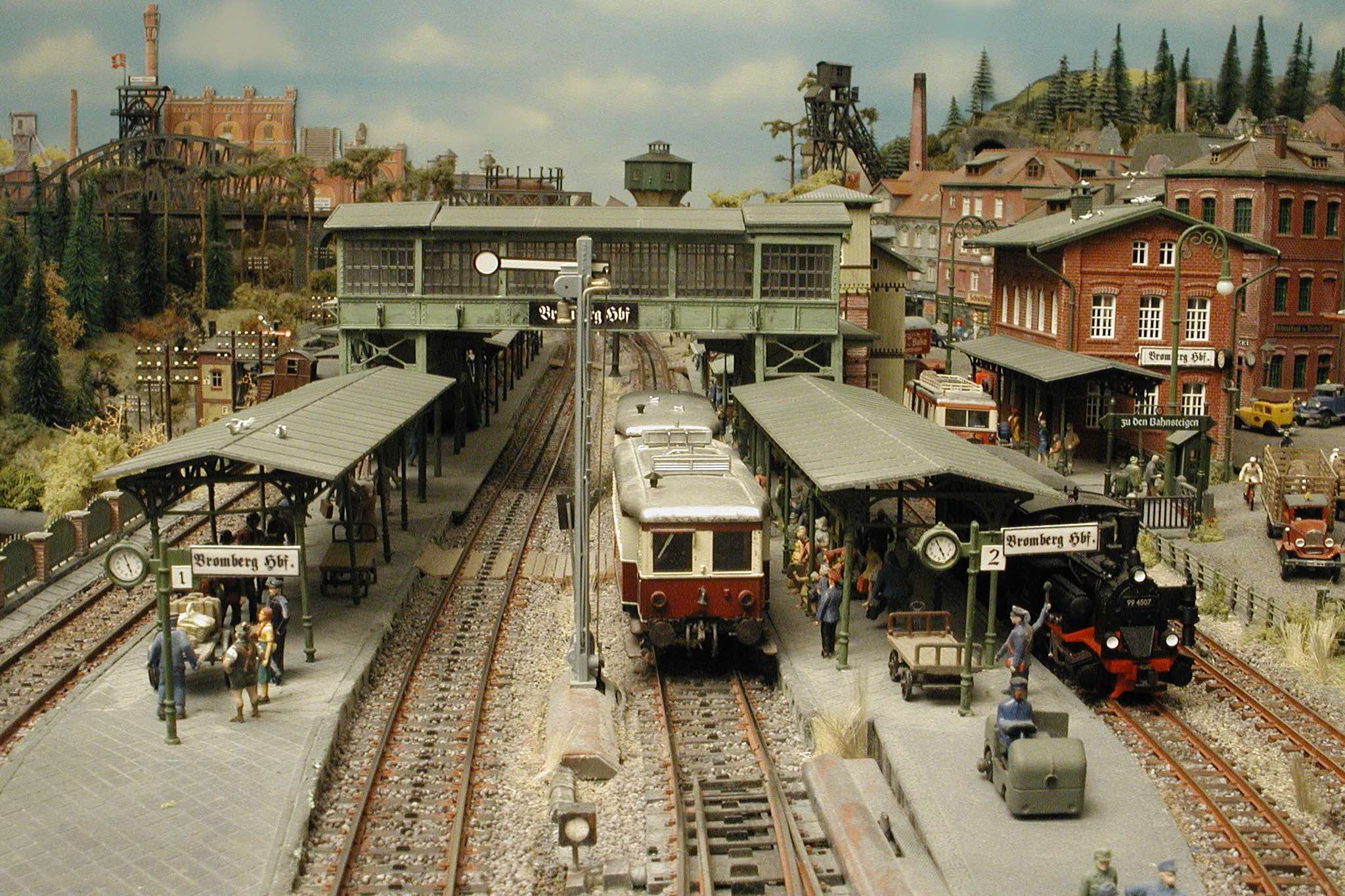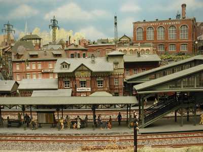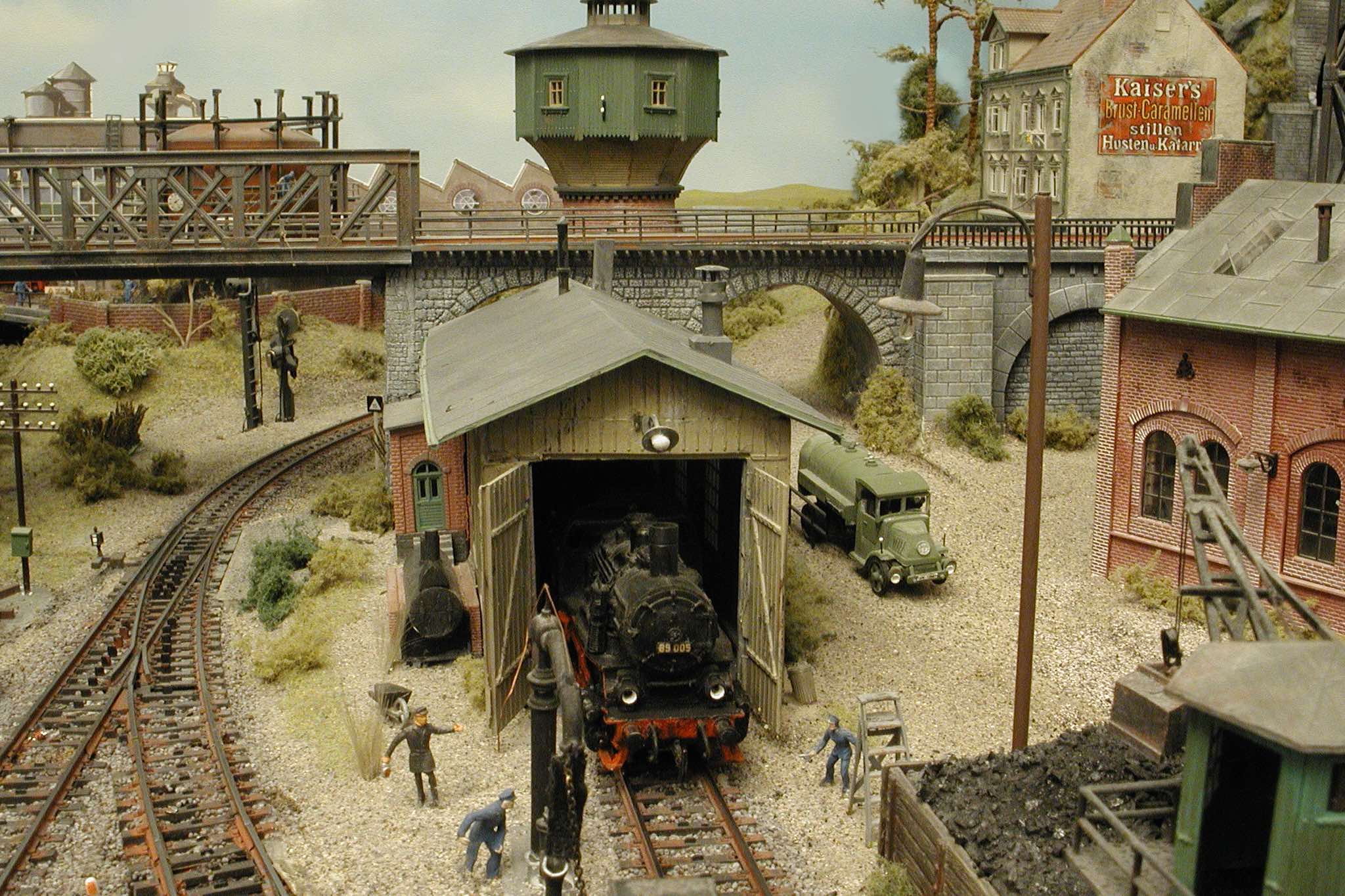 In vielen Fachzeitschriften und Anlagen-Reports holte ich mir Anregungen und Ratschläge für den Aufbau meiner Anlage. Grosse Vorbilder sind und waren für mich die "alten Hasen" wie Bernd Schmid mit den vielen interessanten Vorlagen, die meist in Märklin-Magazinen erschienen sind. Die fantastische Anlage von Wolfgang Borgas sowie die Großstadt-Anlage von Eberhard Schulze, welche beide in Miba Reports vorgestellt wurden, inspirierten mich ebenso wie die Skizzen und Zeichnungen von "Pit-Peg", die eine wahre Fundgrube darstellen und meine Phantasie anregten. Sehr reizvoll war für mich auch, durch Kombinieren und Abwandeln bekannter Bausätze und Bauteile, individuelle Gebäude zu schaffen, die so nicht im Handel zu erwerben sind. Viele Gebäude auf meiner Anlage wurden nach diesem Prinzip erstellt. Mit etwas Farbe - an den richtigen Stellen und mit der richtigen Technik aufgetragen -, lässt sich ja ohne sonderlich grossen Aufwand die realistische Wirkung von Gebäuden erheblich steigern. Viele Ausstattungs- und Kleinteile stammen übrigens auch von englischen und amerikanischen Herstellern. So sind bei den Automodellen neben den Produkten der bekannten Marken wie Marken wie Brekina, Wiking, Roskopf und Busch auch Modelle, die aus Bausätzen von Woodland-Scenics und Jordan entstanden sind, zu sehen. Der Zusammenbau dieser filigranen Weissgussmetall- oder Polystyrol-Bausätze ist oft eine recht anspruchsvolle Angelegenheit. Die Landschaft wird von den verschiedenen Industriebauten und Zechenanlagen mit Fördertürmen geprägt.