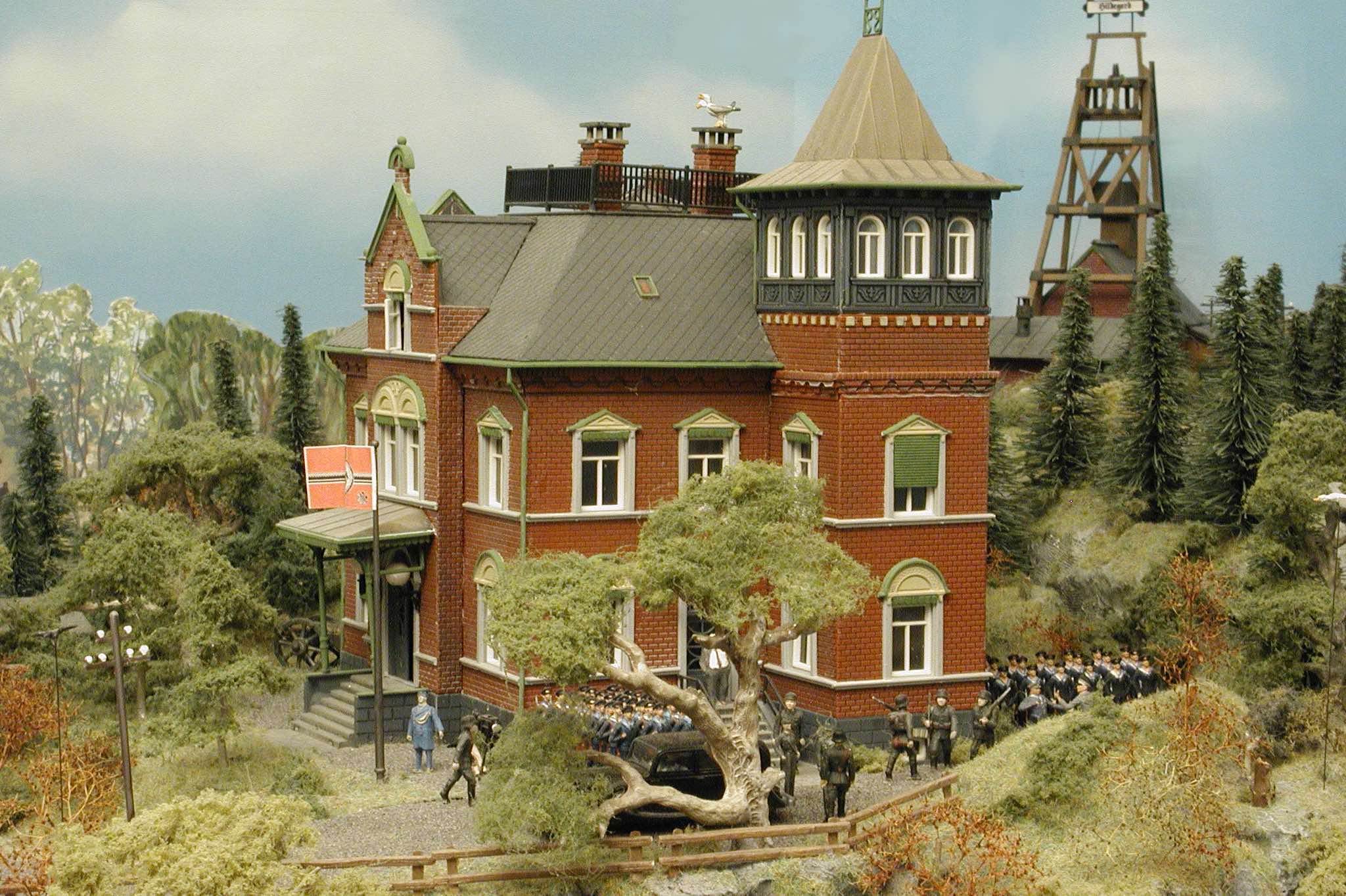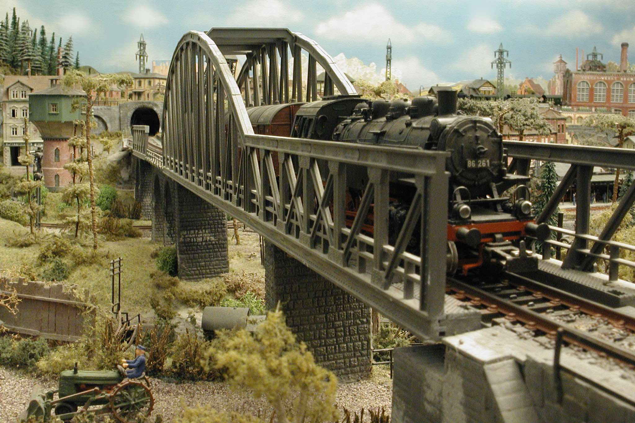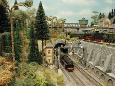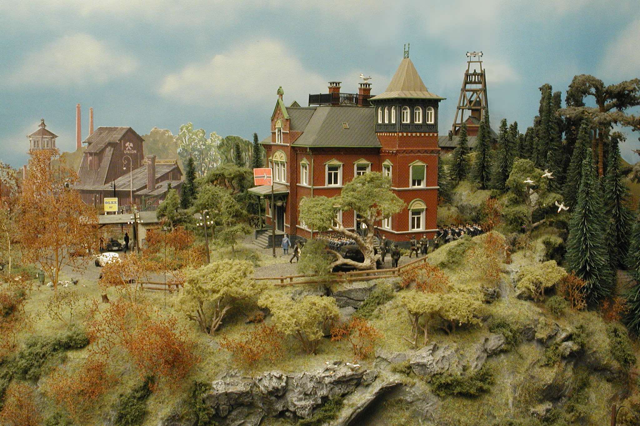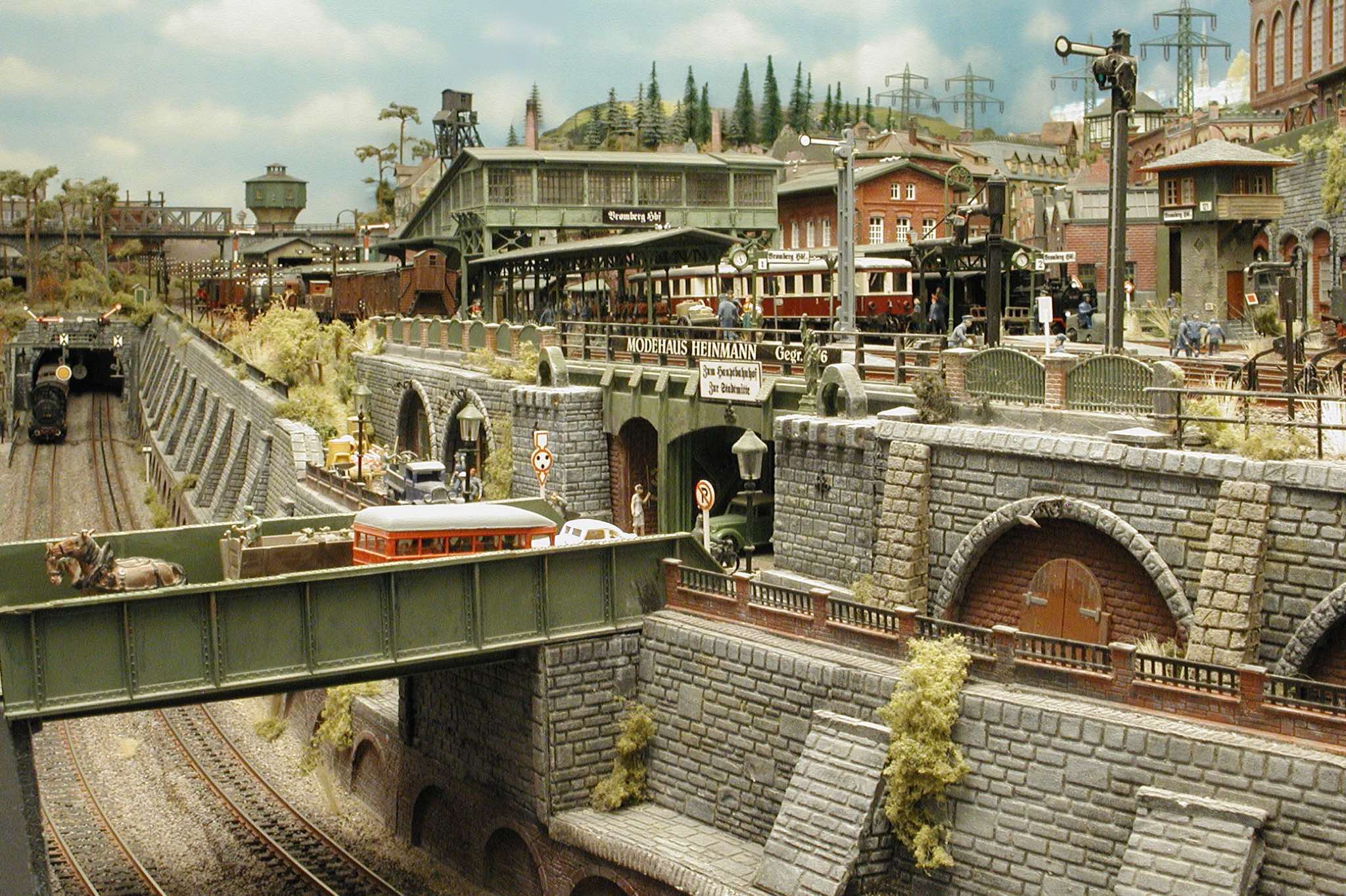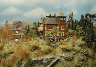 In vielen Fachzeitschriften und Anlagen-Reports holte ich mir Anregungen und Ratschläge für den Aufbau meiner Anlage. Grosse Vorbilder sind und waren für mich die "alten Hasen" wie Bernd Schmid mit den vielen interessanten Vorlagen, die meist in Märklin-Magazinen erschienen sind. Die fantastische Anlage von Wolfgang Borgas sowie die Großstadt-Anlage von Eberhard Schulze, welche beide in Miba Reports vorgestellt wurden, inspirierten mich ebenso wie die Skizzen und Zeichnungen von "Pit-Peg", die eine wahre Fundgrube darstellen und meine Phantasie anregten. Sehr reizvoll war für mich auch, durch Kombinieren und Abwandeln bekannter Bausätze und Bauteile, individuelle Gebäude zu schaffen, die so nicht im Handel zu erwerben sind. Viele Gebäude auf meiner Anlage wurden nach diesem Prinzip erstellt. Mit etwas Farbe - an den richtigen Stellen und mit der richtigen Technik aufgetragen -, lässt sich ja ohne sonderlich grossen Aufwand die realistische Wirkung von Gebäuden erheblich steigern. Viele Ausstattungs- und Kleinteile stammen übrigens auch von englischen und amerikanischen Herstellern. So sind bei den Automodellen neben den Produkten der bekannten Marken wie Marken wie Brekina, Wiking, Roskopf und Busch auch Modelle, die aus Bausätzen von Woodland-Scenics und Jordan entstanden sind, zu sehen. Der Zusammenbau dieser filigranen Weissgussmetall- oder Polystyrol-Bausätze ist oft eine recht anspruchsvolle Angelegenheit. Die Landschaft wird von den verschiedenen Industriebauten und Zechenanlagen mit Fördertürmen geprägt.