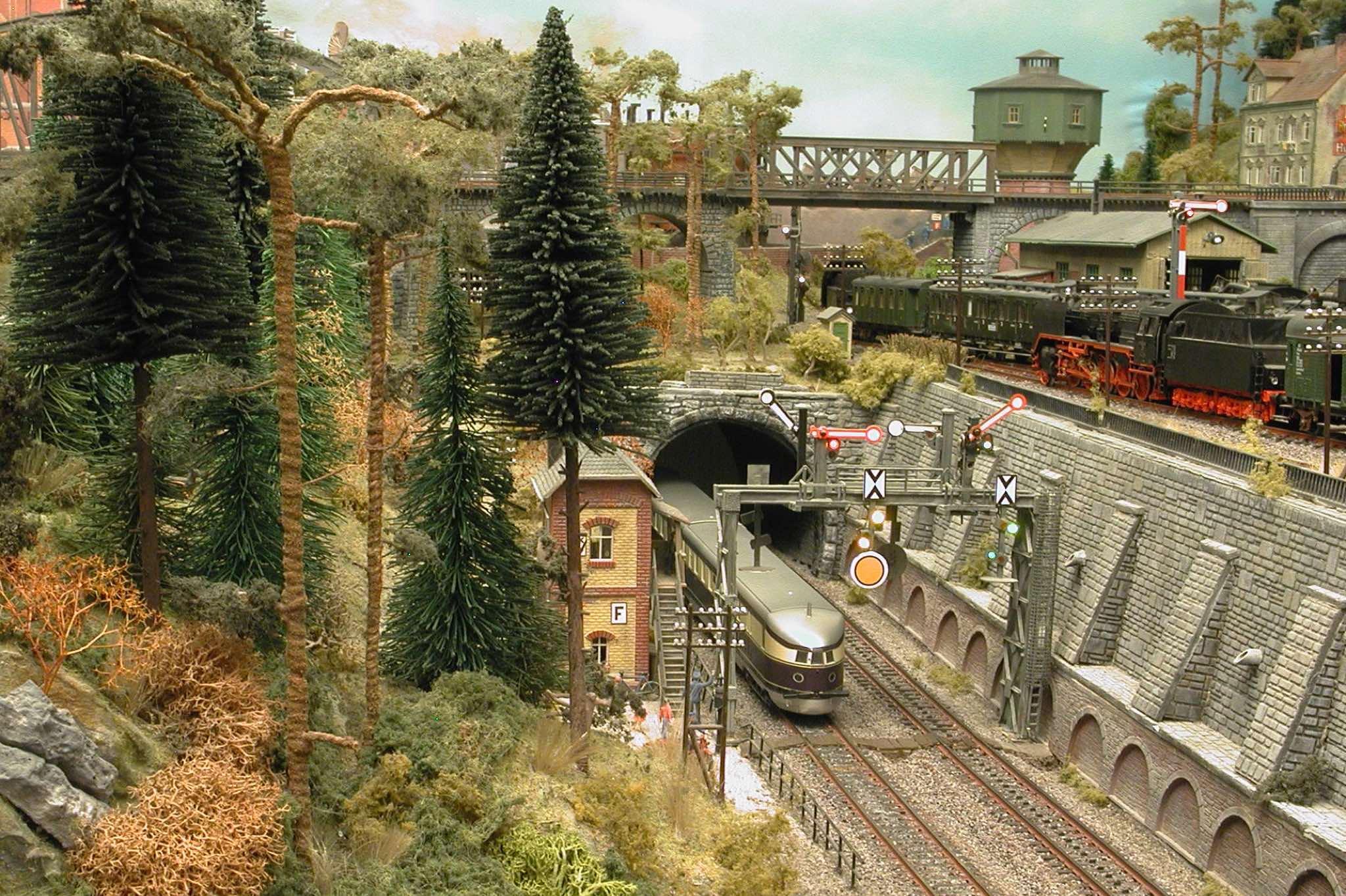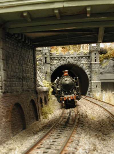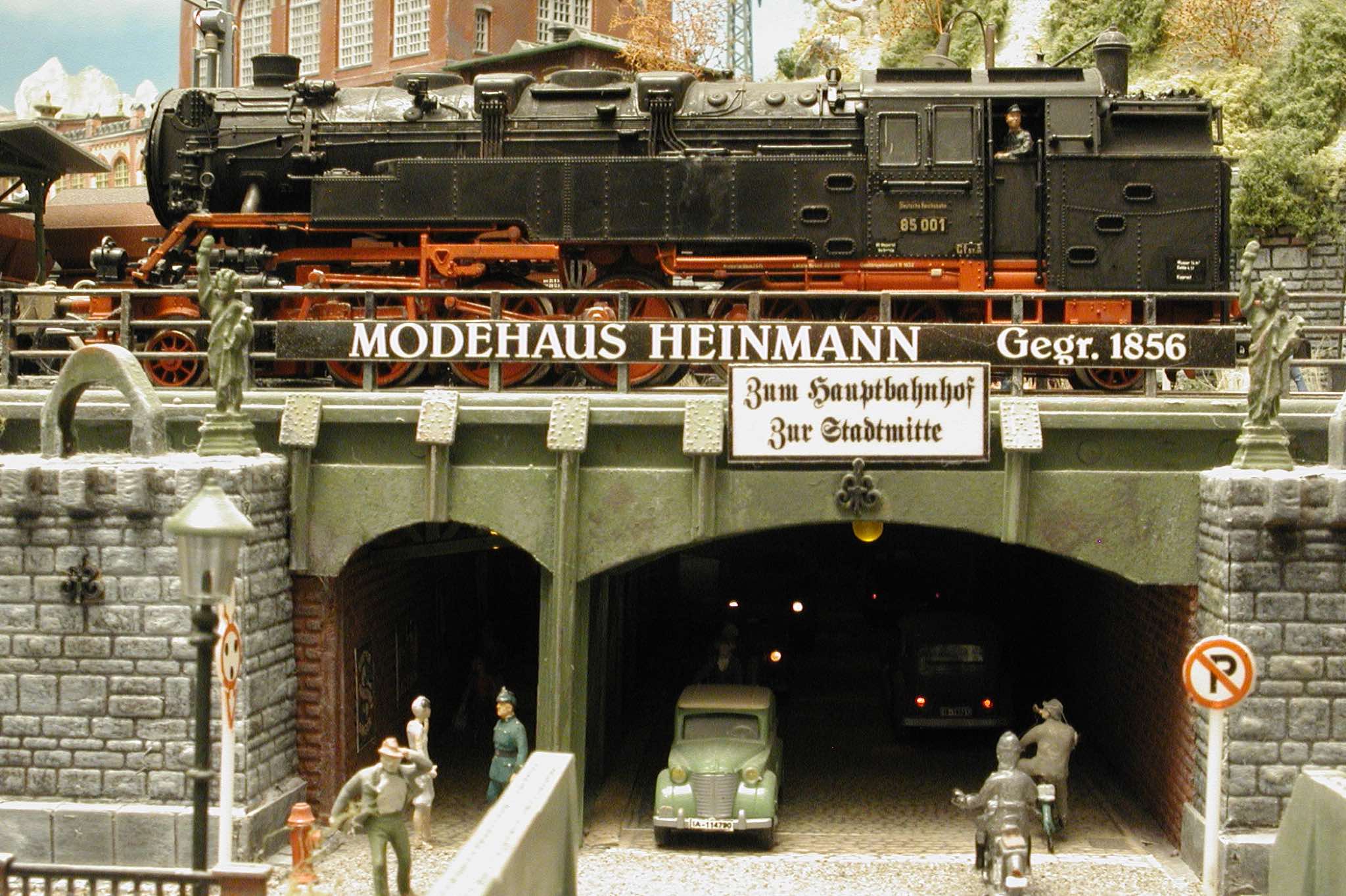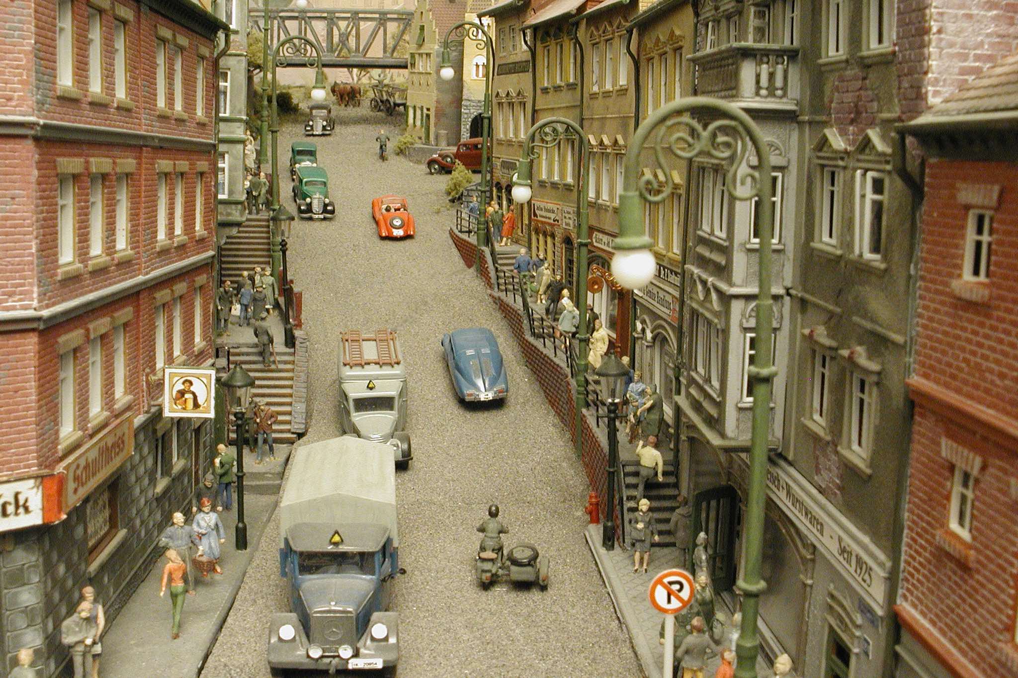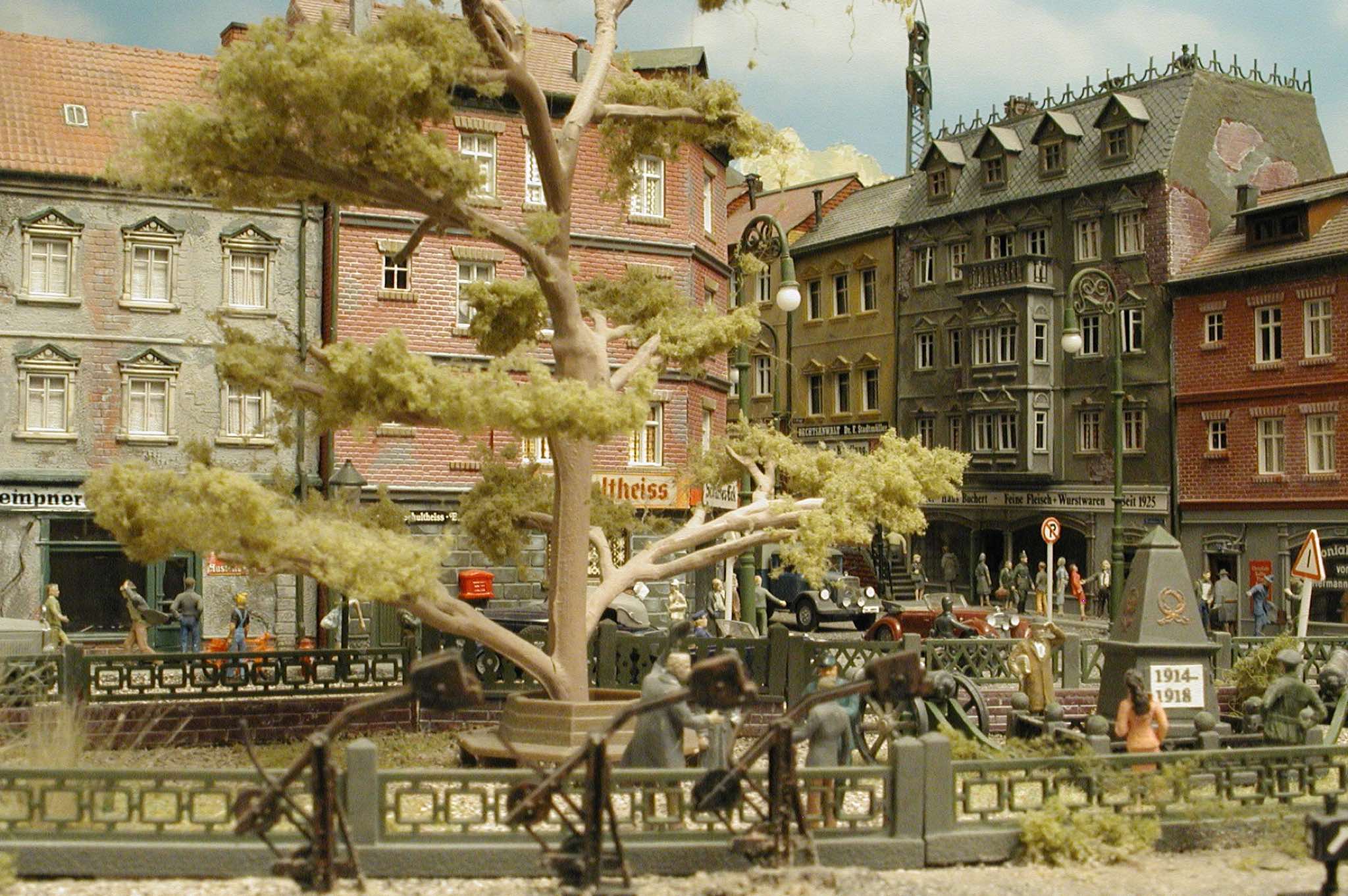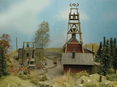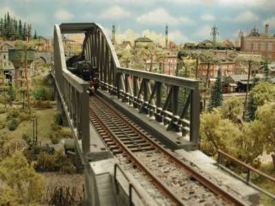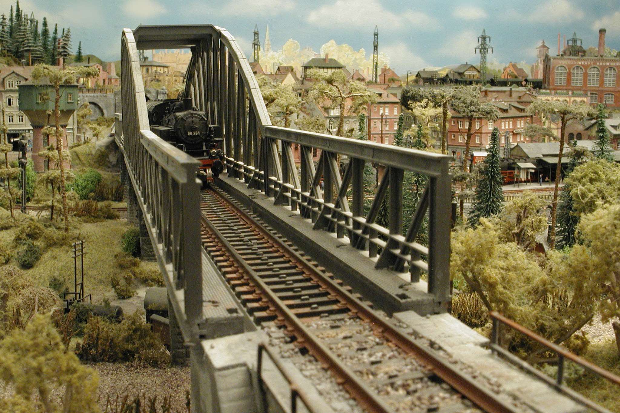 In vielen Fachzeitschriften und Anlagen-Reports holte ich mir Anregungen und Ratschläge für den Aufbau meiner Anlage. Grosse Vorbilder sind und waren für mich die "alten Hasen" wie Bernd Schmid mit den vielen interessanten Vorlagen, die meist in Märklin-Magazinen erschienen sind. Die fantastische Anlage von Wolfgang Borgas sowie die Großstadt-Anlage von Eberhard Schulze, welche beide in Miba Reports vorgestellt wurden, inspirierten mich ebenso wie die Skizzen und Zeichnungen von "Pit-Peg", die eine wahre Fundgrube darstellen und meine Phantasie anregten. Sehr reizvoll war für mich auch, durch Kombinieren und Abwandeln bekannter Bausätze und Bauteile, individuelle Gebäude zu schaffen, die so nicht im Handel zu erwerben sind. Viele Gebäude auf meiner Anlage wurden nach diesem Prinzip erstellt. Mit etwas Farbe - an den richtigen Stellen und mit der richtigen Technik aufgetragen -, lässt sich ja ohne sonderlich grossen Aufwand die realistische Wirkung von Gebäuden erheblich steigern. Viele Ausstattungs- und Kleinteile stammen übrigens auch von englischen und amerikanischen Herstellern. So sind bei den Automodellen neben den Produkten der bekannten Marken wie Marken wie Brekina, Wiking, Roskopf und Busch auch Modelle, die aus Bausätzen von Woodland-Scenics und Jordan entstanden sind, zu sehen. Der Zusammenbau dieser filigranen Weissgussmetall- oder Polystyrol-Bausätze ist oft eine recht anspruchsvolle Angelegenheit. Die Landschaft wird von den verschiedenen Industriebauten und Zechenanlagen mit Fördertürmen geprägt.