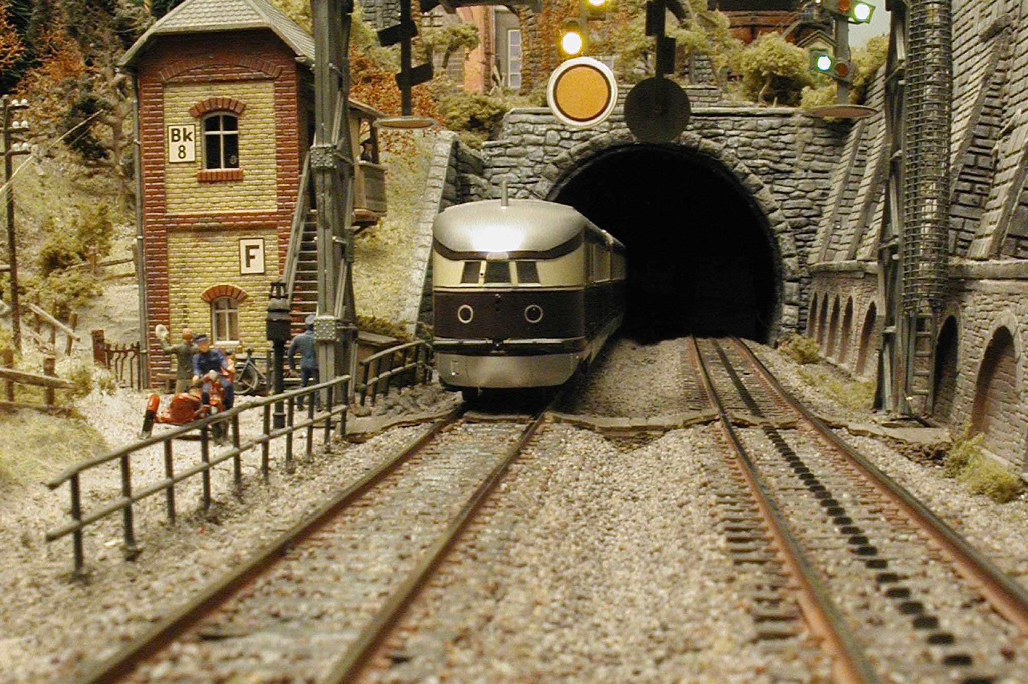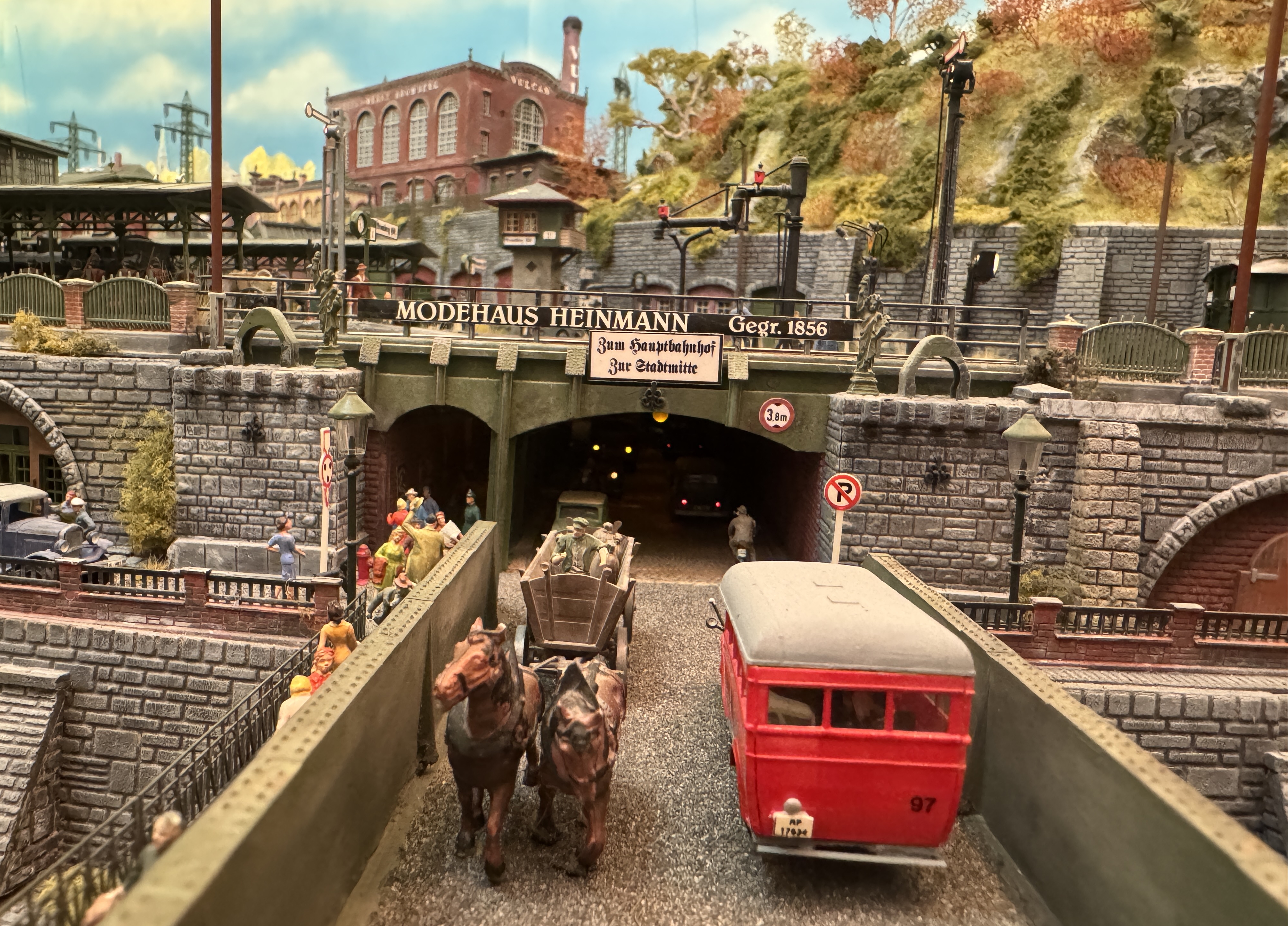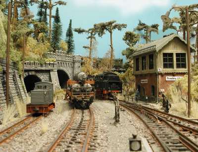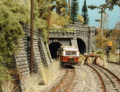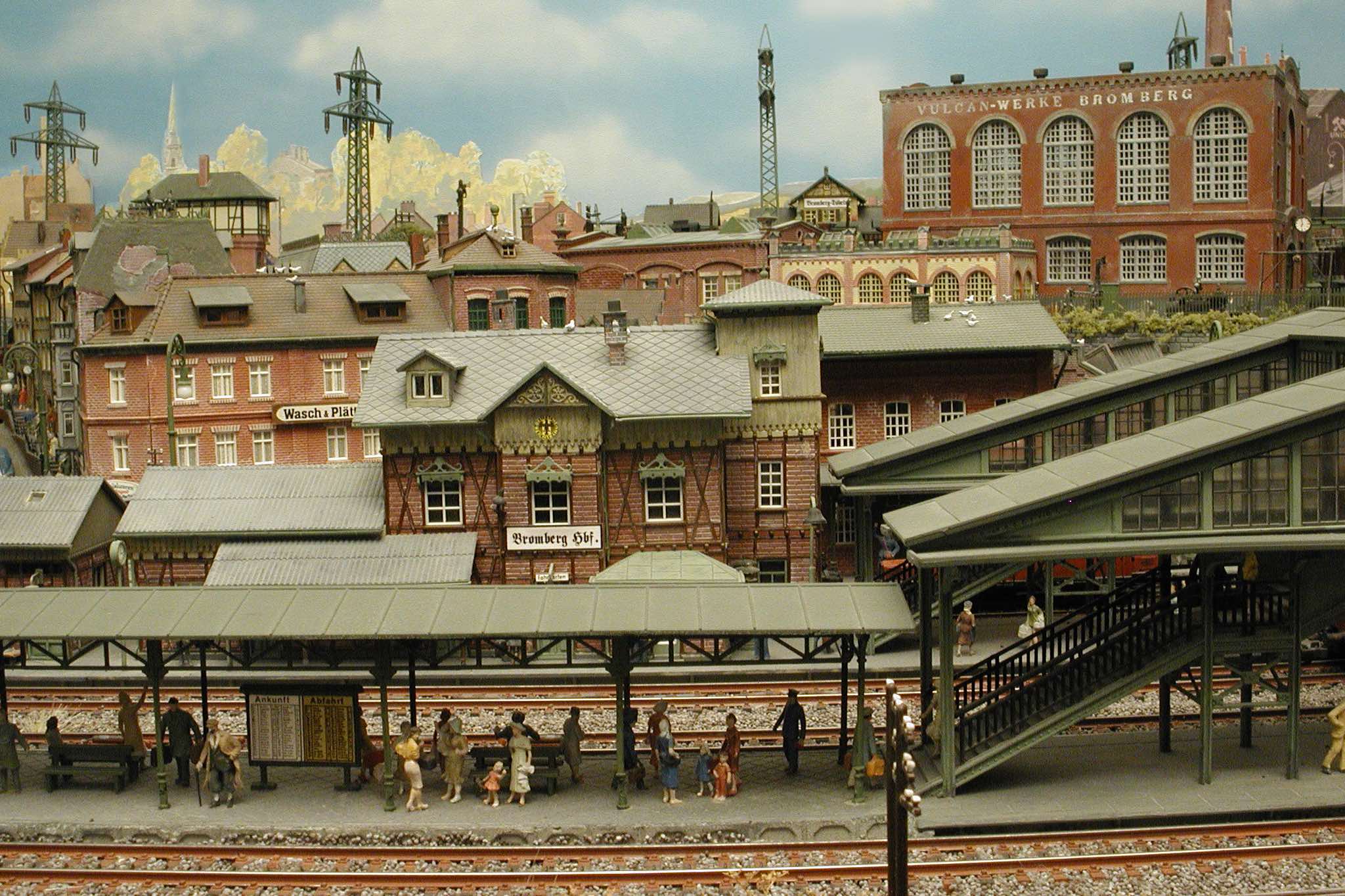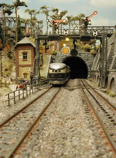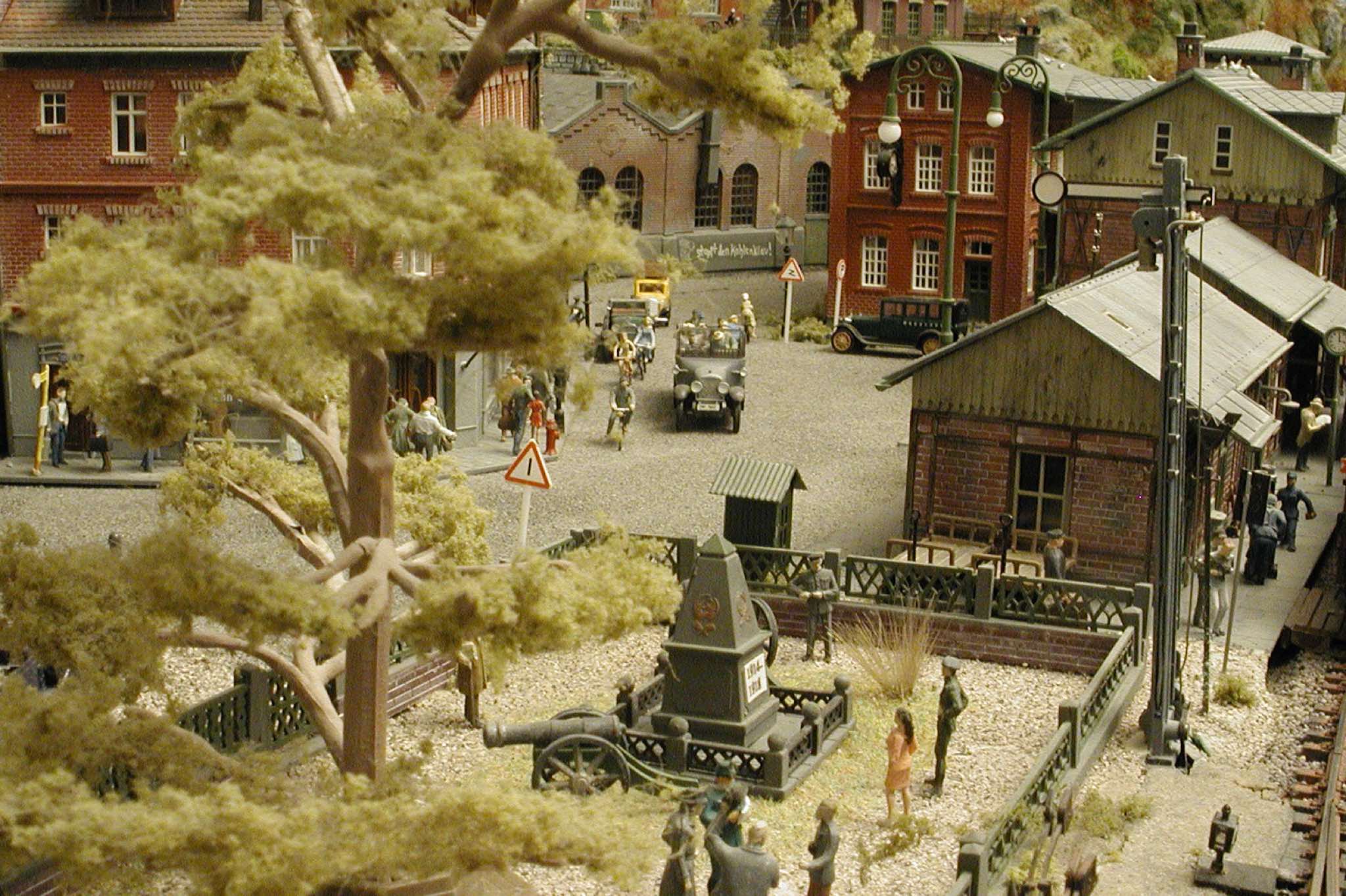 In vielen Fachzeitschriften und Anlagen-Reports holte ich mir Anregungen und Ratschläge für den Aufbau meiner Anlage. Grosse Vorbilder sind und waren für mich die "alten Hasen" wie Bernd Schmid mit den vielen interessanten Vorlagen, die meist in Märklin-Magazinen erschienen sind. Die fantastische Anlage von Wolfgang Borgas sowie die Großstadt-Anlage von Eberhard Schulze, welche beide in Miba Reports vorgestellt wurden, inspirierten mich ebenso wie die Skizzen und Zeichnungen von "Pit-Peg", die eine wahre Fundgrube darstellen und meine Phantasie anregten. Sehr reizvoll war für mich auch, durch Kombinieren und Abwandeln bekannter Bausätze und Bauteile, individuelle Gebäude zu schaffen, die so nicht im Handel zu erwerben sind. Viele Gebäude auf meiner Anlage wurden nach diesem Prinzip erstellt. Mit etwas Farbe - an den richtigen Stellen und mit der richtigen Technik aufgetragen -, lässt sich ja ohne sonderlich grossen Aufwand die realistische Wirkung von Gebäuden erheblich steigern. Viele Ausstattungs- und Kleinteile stammen übrigens auch von englischen und amerikanischen Herstellern. So sind bei den Automodellen neben den Produkten der bekannten Marken wie Marken wie Brekina, Wiking, Roskopf und Busch auch Modelle, die aus Bausätzen von Woodland-Scenics und Jordan entstanden sind, zu sehen. Der Zusammenbau dieser filigranen Weissgussmetall- oder Polystyrol-Bausätze ist oft eine recht anspruchsvolle Angelegenheit. Die Landschaft wird von den verschiedenen Industriebauten und Zechenanlagen mit Fördertürmen geprägt.