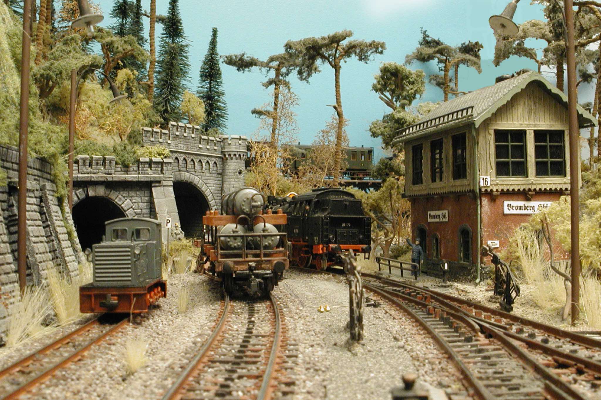 Besonderen Wert legte ich auch auf die Hintergrundkulisse, die für einen guten Gesamteindruck einer Modellbahnanlage sehr wichtig ist. Der Himmel-Hintergrund zusammen mit den Hintergrundkulissen von MZZ zaubert die fehlende Tiefe.