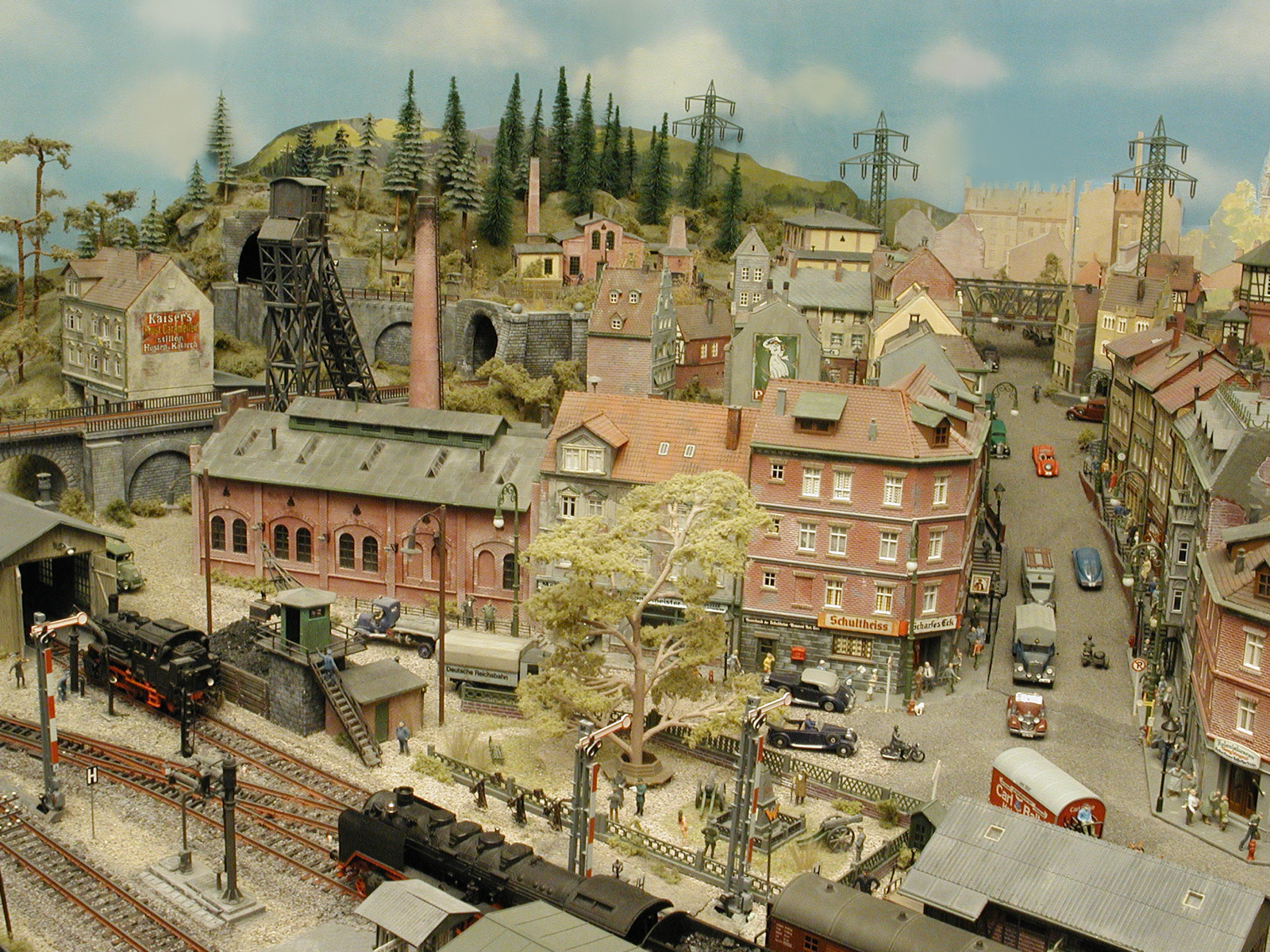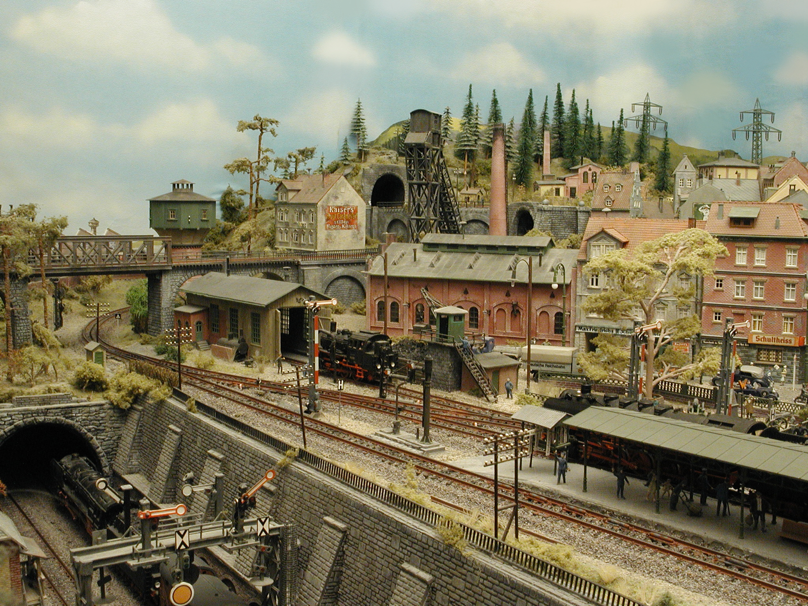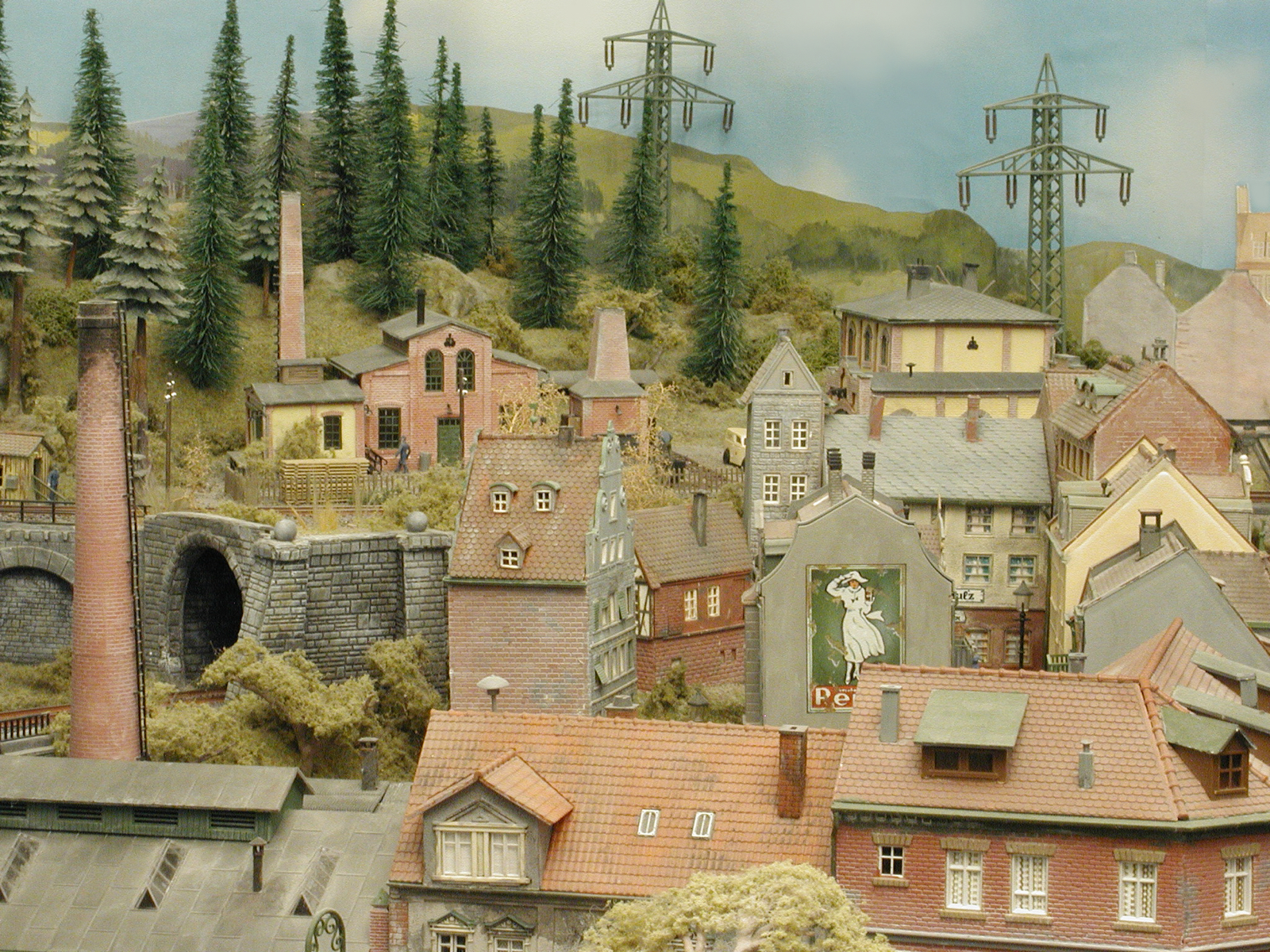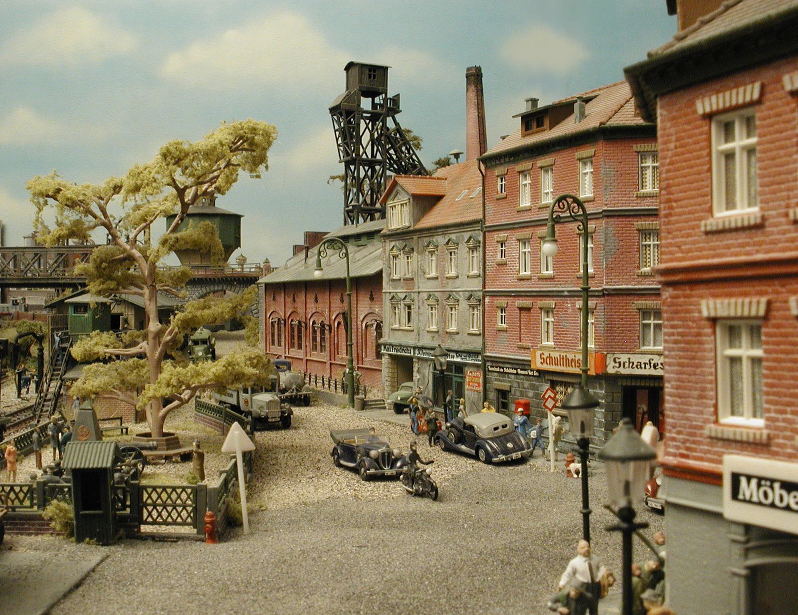 Die landschafliche Gestaltung der Anlage bereitete mir grossen Spass. In vielen Fachzeitschriften und Anlagen-Reports holte ich mir Anregungen und Ratschläge für den Aufbau meiner Anlage. Grosse Vorbilder sind und waren für mich die "alten Hasen" wie Bernd Schmid mit den vielen interessanten Vorlagen, die meist in Märklin-Magazinen erschienen sind. Die fantastische Anlage von Wolfgang Borgas sowie die Großstadt-Anlage von Eberhard Schulze, welche beide in Miba Reports vorgestellt wurden, inspirierten mich ebenso wie die Skizzen und Zeichnungen von "Pit-Peg", die eine wahre Fundgrube darstellen und meine Phantasie anregten. Sehr reizvoll war für mich auch, durch Kombinieren und Abwandeln bekannter Bausätze und Bauteile, individuelle Gebäude zu schaffen, die so nicht im Handel zu erwerben sind. Viele Gebäude auf meiner Anlage wurden nach diesem Prinzip erstellt. Mit etwas Farbe - an den richtigen Stellen und mit der richtigen Technik aufgetragen -, lässt sich ja ohne sonderlich grossen Aufwand die realistische Wirkung von Gebäuden erheblich steigern. Viele Ausstattungs- und Kleinteile stammen übrigens auch von englischen und amerikanischen Herstellern. So sind bei den Automodellen neben den Produkten der bekannten Marken wie Marken wie Brekina, Wiking, Roskopf und Busch auch Modelle, die aus Bausätzen von Woodland-Scenics und Jordan entstanden sind, zu sehen. Der Zusammenbau dieser filigranen Weissgussmetall- oder Polystyrol-Bausätze ist oft eine recht anspruchsvolle Angelegenheit. Die Landschaft wird von den verschiedenen Industriebauten und Zechenanlagen mit Fördertürmen geprägt. Besonderen Wert legte ich auch auf die Hintergrundkulisse, die für einen guten Gesamteindruck einer Modellbahnanlage sehr wichtig ist. Der Himmel-Hintergrund zusammen mit den Hintergrundkulissen von MZZ zaubert die fehlende Tiefe. |