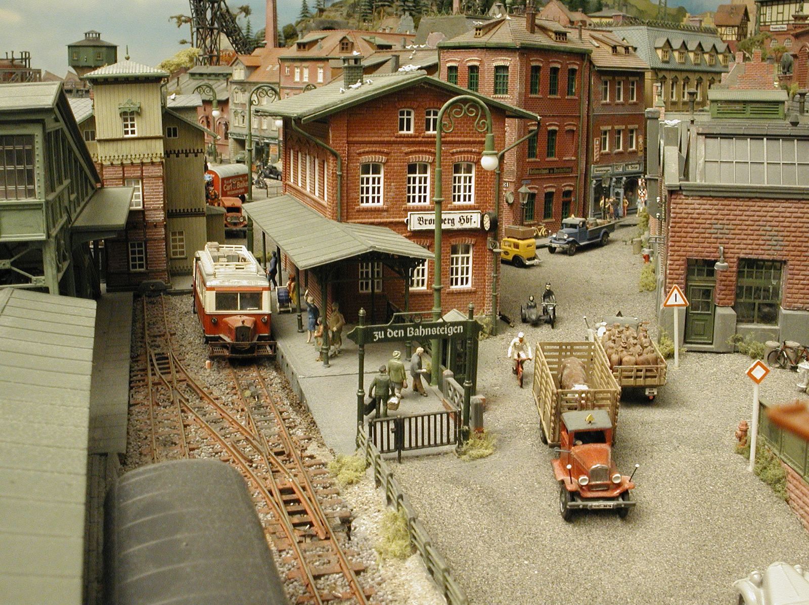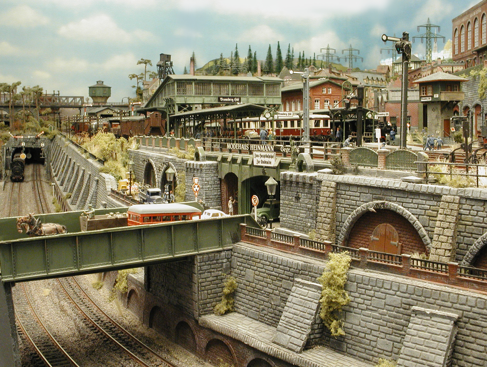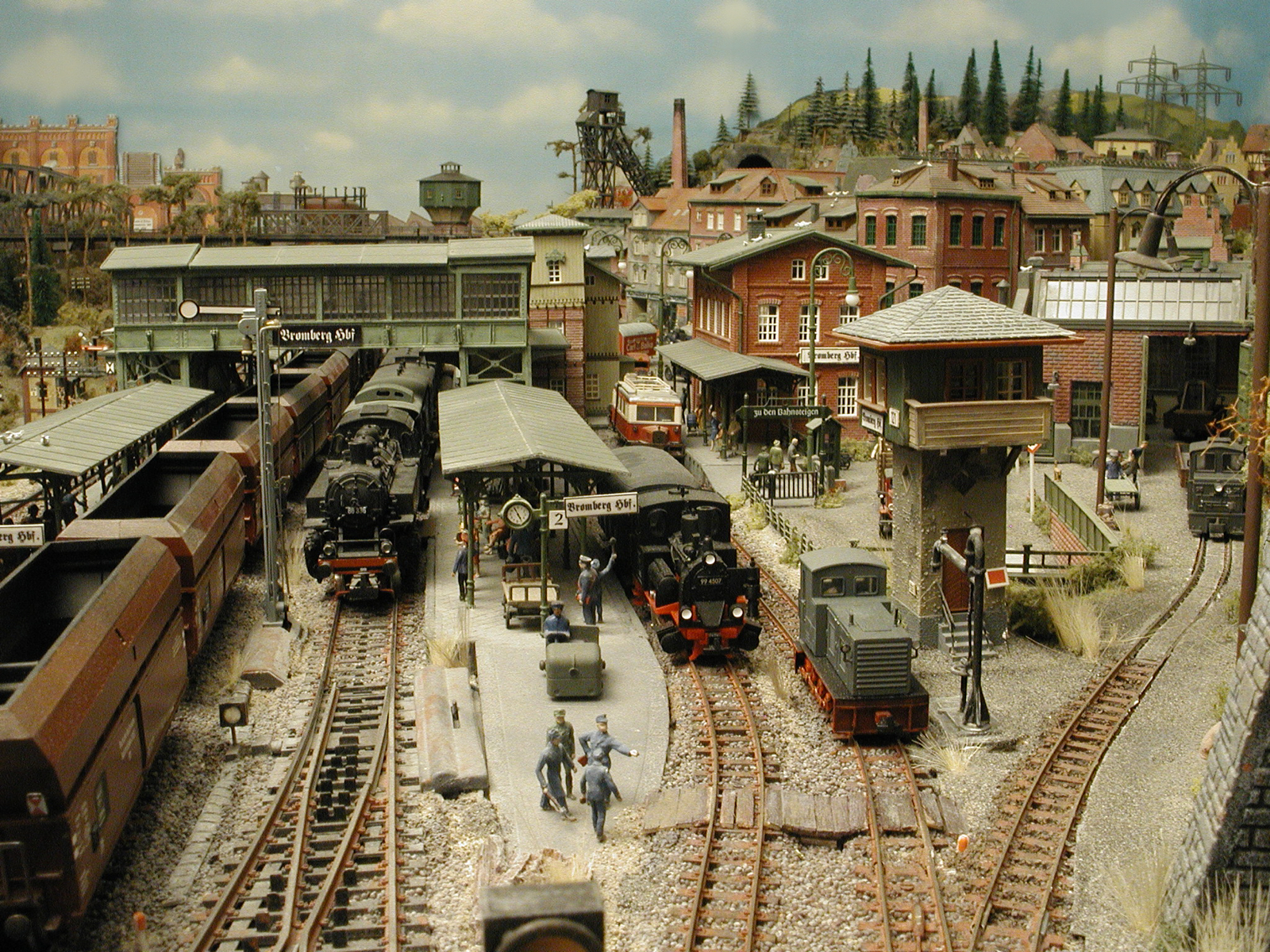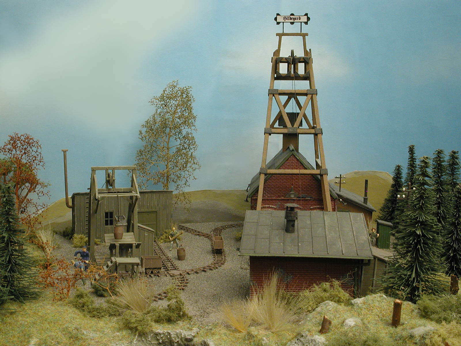 Die landschafliche Gestaltung der Anlage bereitete mir grossen Spass. In vielen Fachzeitschriften und Anlagen-Reports holte ich mir Anregungen und Ratschläge für den Aufbau meiner Anlage. Grosse Vorbilder sind und waren für mich die "alten Hasen" wie Bernd Schmid mit den vielen interessanten Vorlagen, die meist in Märklin-Magazinen erschienen sind. Die fantastische Anlage von Wolfgang Borgas sowie die Großstadt-Anlage von Eberhard Schulze, welche beide in Miba Reports vorgestellt wurden, inspirierten mich ebenso wie die Skizzen und Zeichnungen von "Pit-Peg", die eine wahre Fundgrube darstellen und meine Phantasie anregten. Sehr reizvoll war für mich auch, durch Kombinieren und Abwandeln bekannter Bausätze und Bauteile, individuelle Gebäude zu schaffen, die so nicht im Handel zu erwerben sind. Viele Gebäude auf meiner Anlage wurden nach diesem Prinzip erstellt. Mit etwas Farbe - an den richtigen Stellen und mit der richtigen Technik aufgetragen -, lässt sich ja ohne sonderlich grossen Aufwand die realistische Wirkung von Gebäuden erheblich steigern. Viele Ausstattungs- und Kleinteile stammen übrigens auch von englischen und amerikanischen Herstellern. So sind bei den Automodellen neben den Produkten der bekannten Marken wie Marken wie Brekina, Wiking, Roskopf und Busch auch Modelle, die aus Bausätzen von Woodland-Scenics und Jordan entstanden sind, zu sehen. Der Zusammenbau dieser filigranen Weissgussmetall- oder Polystyrol-Bausätze ist oft eine recht anspruchsvolle Angelegenheit. Die Landschaft wird von den verschiedenen Industriebauten und Zechenanlagen mit Fördertürmen geprägt. Besonderen Wert legte ich auch auf die Hintergrundkulisse, die für einen guten Gesamteindruck einer Modellbahnanlage sehr wichtig ist. Der Himmel-Hintergrund zusammen mit den Hintergrundkulissen von MZZ zaubert die fehlende Tiefe. |
