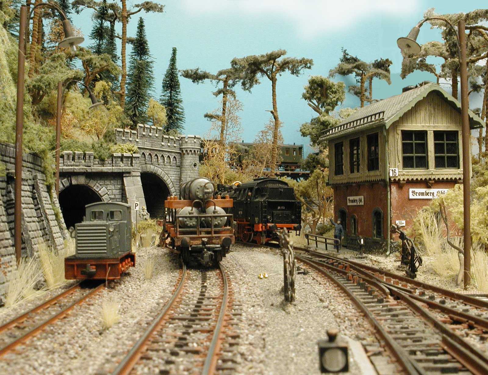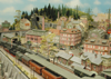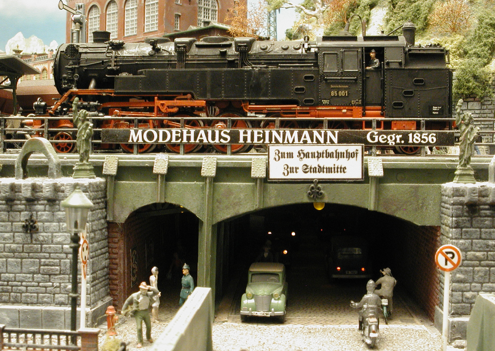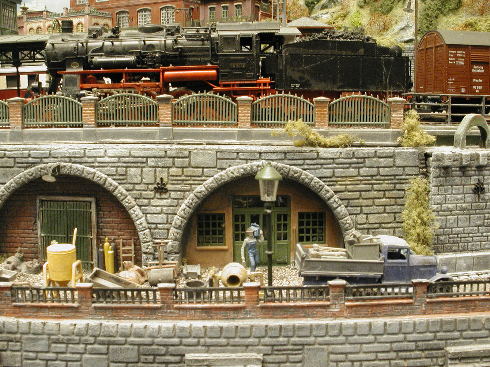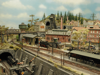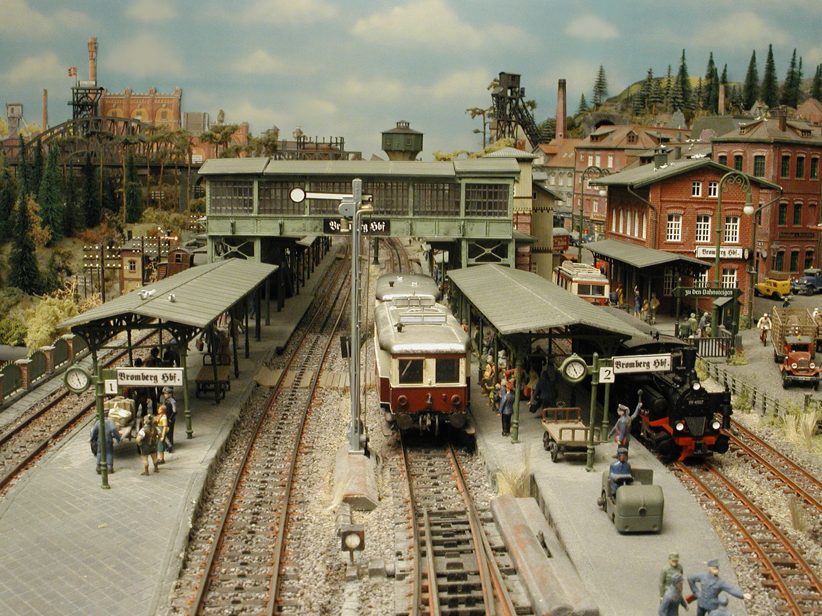 Die landschafliche Gestaltung der Anlage bereitete mir grossen Spass. In vielen Fachzeitschriften und Anlagen-Reports holte ich mir Anregungen und Ratschläge für den Aufbau meiner Anlage. Grosse Vorbilder sind und waren für mich die "alten Hasen" wie Bernd Schmid mit den vielen interessanten Vorlagen, die meist in Märklin-Magazinen erschienen sind. Die fantastische Anlage von Wolfgang Borgas sowie die Großstadt-Anlage von Eberhard Schulze, welche beide in Miba Reports vorgestellt wurden, inspirierten mich ebenso wie die Skizzen und Zeichnungen von "Pit-Peg", die eine wahre Fundgrube darstellen und meine Phantasie anregten. Sehr reizvoll war für mich auch, durch Kombinieren und Abwandeln bekannter Bausätze und Bauteile, individuelle Gebäude zu schaffen, die so nicht im Handel zu erwerben sind. Viele Gebäude auf meiner Anlage wurden nach diesem Prinzip erstellt. Mit etwas Farbe - an den richtigen Stellen und mit der richtigen Technik aufgetragen -, lässt sich ja ohne sonderlich grossen Aufwand die realistische Wirkung von Gebäuden erheblich steigern. Viele Ausstattungs- und Kleinteile stammen übrigens auch von englischen und amerikanischen Herstellern. So sind bei den Automodellen neben den Produkten der bekannten Marken wie Marken wie Brekina, Wiking, Roskopf und Busch auch Modelle, die aus Bausätzen von Woodland-Scenics und Jordan entstanden sind, zu sehen. Der Zusammenbau dieser filigranen Weissgussmetall- oder Polystyrol-Bausätze ist oft eine recht anspruchsvolle Angelegenheit. Die Landschaft wird von den verschiedenen Industriebauten und Zechenanlagen mit Fördertürmen geprägt. Besonderen Wert legte ich auch auf die Hintergrundkulisse, die für einen guten Gesamteindruck einer Modellbahnanlage sehr wichtig ist. Der Himmel-Hintergrund zusammen mit den Hintergrundkulissen von MZZ zaubert die fehlende Tiefe. |