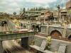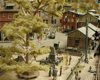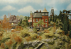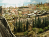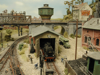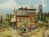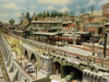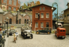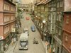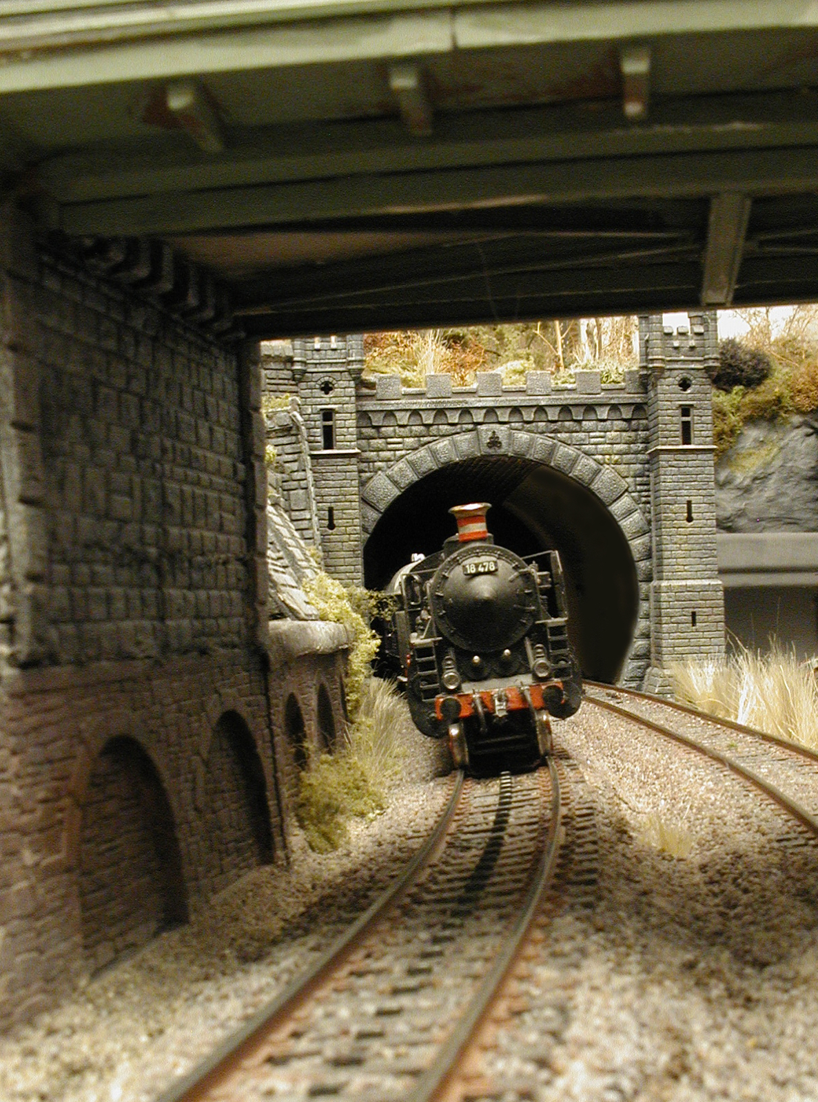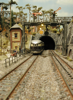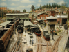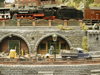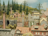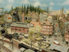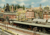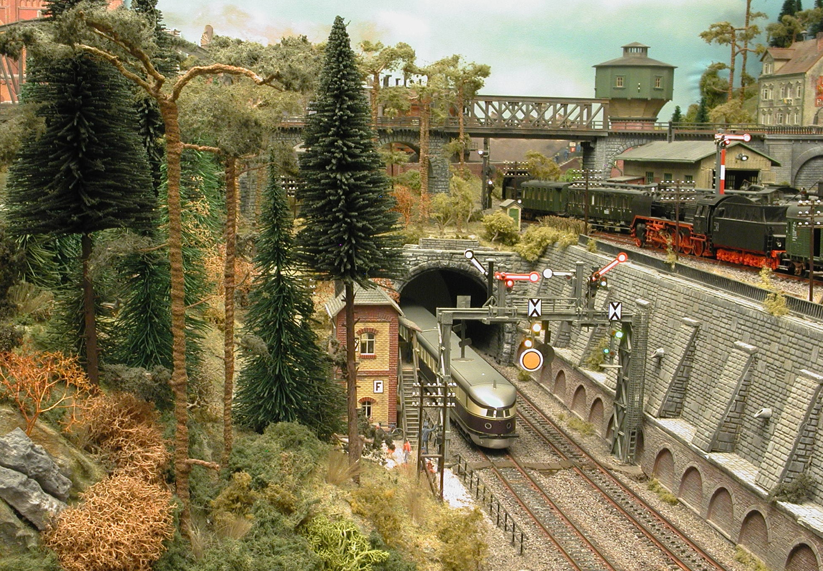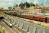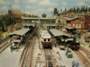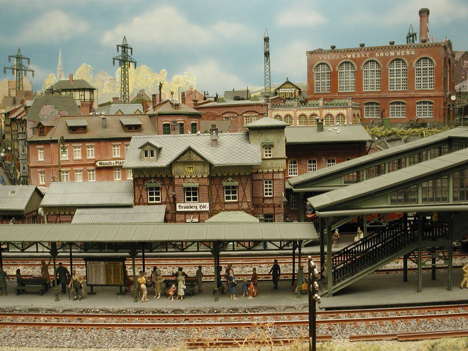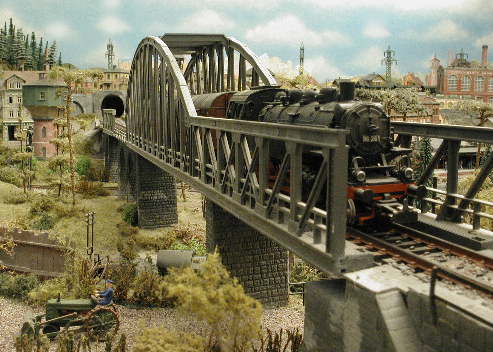 Die landschafliche Gestaltung der Anlage bereitete mir grossen Spass. In vielen Fachzeitschriften und Anlagen-Reports holte ich mir Anregungen und Ratschläge für den Aufbau meiner Anlage. Grosse Vorbilder sind und waren für mich die "alten Hasen" wie Bernd Schmid mit den vielen interessanten Vorlagen, die meist in Märklin-Magazinen erschienen sind. Die fantastische Anlage von Wolfgang Borgas sowie die Großstadt-Anlage von Eberhard Schulze, welche beide in Miba Reports vorgestellt wurden, inspirierten mich ebenso wie die Skizzen und Zeichnungen von "Pit-Peg", die eine wahre Fundgrube darstellen und meine Phantasie anregten. Sehr reizvoll war für mich auch, durch Kombinieren und Abwandeln bekannter Bausätze und Bauteile, individuelle Gebäude zu schaffen, die so nicht im Handel zu erwerben sind. Viele Gebäude auf meiner Anlage wurden nach diesem Prinzip erstellt. Mit etwas Farbe - an den richtigen Stellen und mit der richtigen Technik aufgetragen -, lässt sich ja ohne sonderlich grossen Aufwand die realistische Wirkung von Gebäuden erheblich steigern. Viele Ausstattungs- und Kleinteile stammen übrigens auch von englischen und amerikanischen Herstellern. So sind bei den Automodellen neben den Produkten der bekannten Marken wie Marken wie Brekina, Wiking, Roskopf und Busch auch Modelle, die aus Bausätzen von Woodland-Scenics und Jordan entstanden sind, zu sehen. Der Zusammenbau dieser filigranen Weissgussmetall- oder Polystyrol-Bausätze ist oft eine recht anspruchsvolle Angelegenheit. Die Landschaft wird von den verschiedenen Industriebauten und Zechenanlagen mit Fördertürmen geprägt. Besonderen Wert legte ich auch auf die Hintergrundkulisse, die für einen guten Gesamteindruck einer Modellbahnanlage sehr wichtig ist. Der Himmel-Hintergrund zusammen mit den Hintergrundkulissen von MZZ zaubert die fehlende Tiefe. |