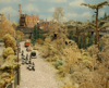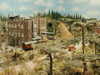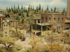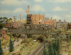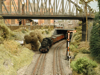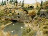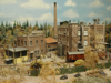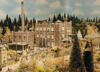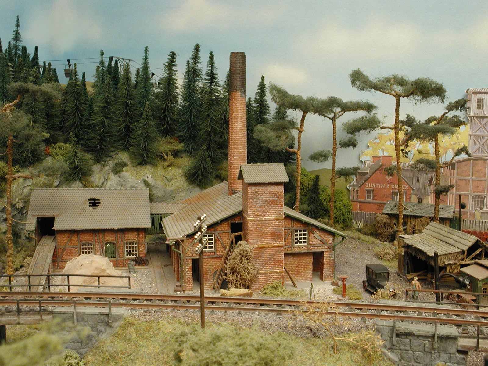 Die alte Ziegelei liegt unterhalb des Bahndamms an der Strecke, die über die grosse Bogenbrücke führt. Im Hintergrund erkennt man eine Loren Seilbahn (Brawa), die den Industriecharakter der Landschaft zusätzlich unterstreicht. Die Nebenstrecke führt über eine kleine Brücke in den nachfolgenden Tunnel in den nicht weiter einsehbaren Streckenabschnitt der Anlage. Die H0e-Feldbahn bringt den Nachschub aus einem weiter entfernten Steinbruch für das Schotterwerk. |