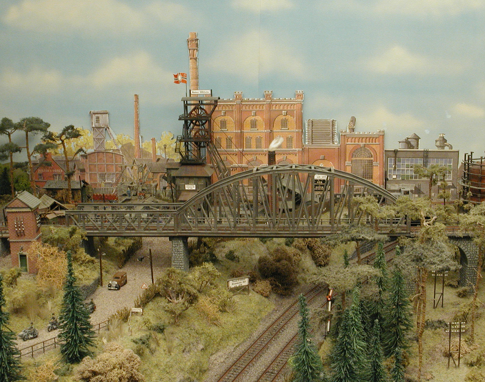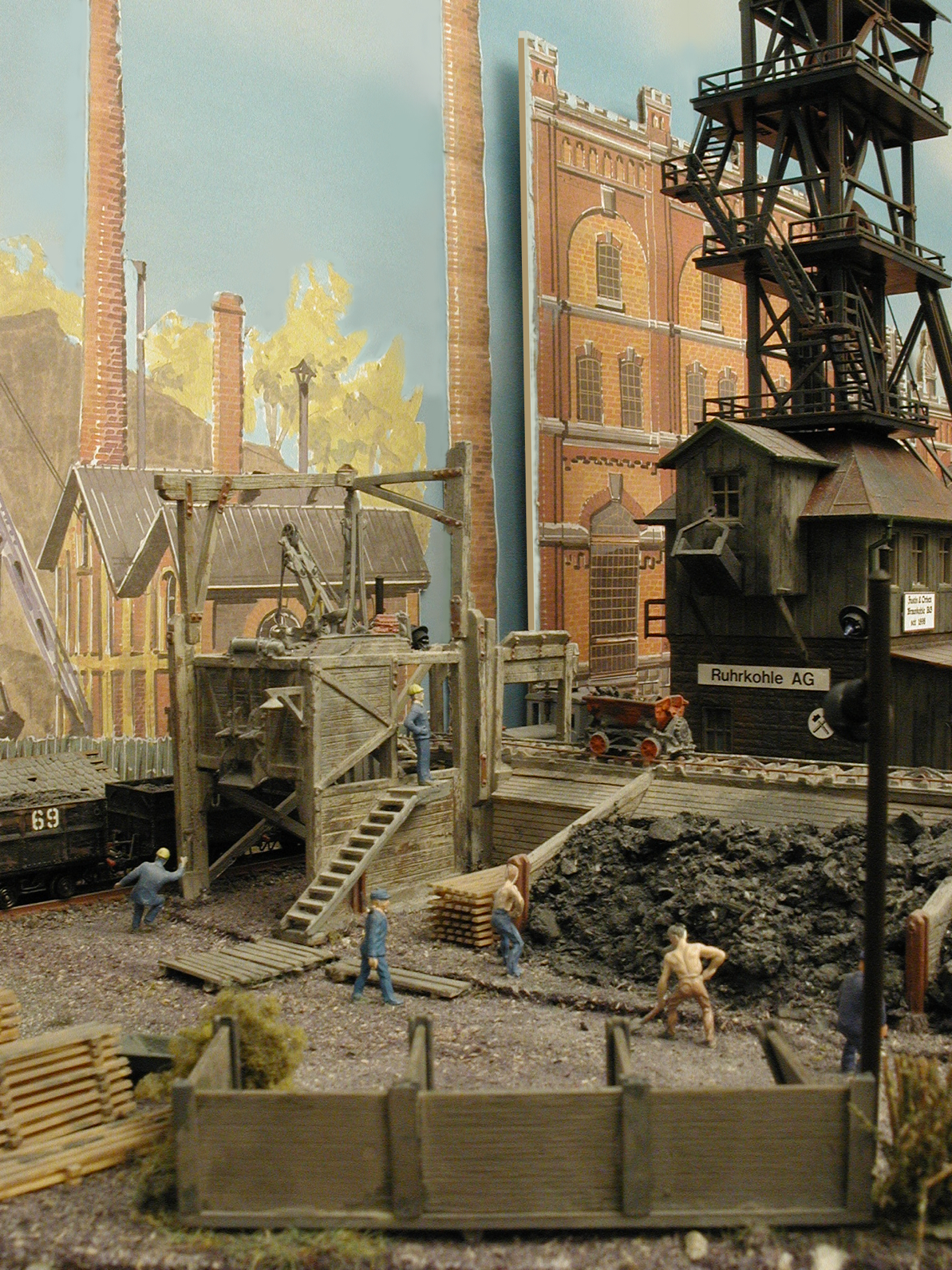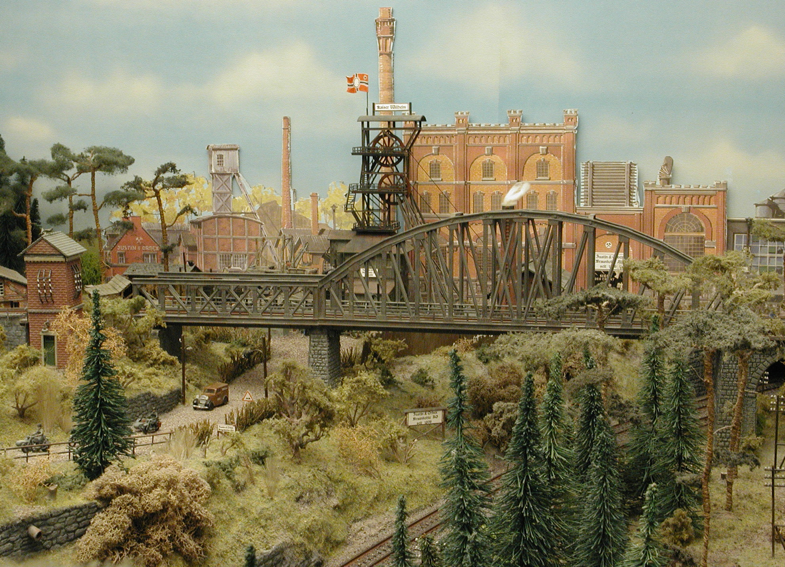 Zechenanlage "Kaiser Wilhelm" Die kleine Zeche "Kaiser Wilhelm II“ mit dem Förderturm ist ein weiterer Blickfang. Die Verladestation der Zeche entstand aus einem Weißmetall-Bausatz (Woodland Scenics) und Kleinteilen aus der "Restekiste". Der Abtransport des schwarzen Goldes erfolgt mit der schmalspurigen Industriebahn. Als Zuglok ist eine HF130C von Bemo im Einsatz. Unterhalb der Bogenbrücke führt die zweigleisige Hauptbahn hindurch. BR 57 2205 (Roco) unterwegs mit einem Güterzug auf der Hauptstrecke. Kurz darauf rauscht der "Fliegende Hamburger“ (Kato) unter der Brücke hindurch... |