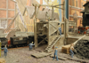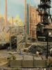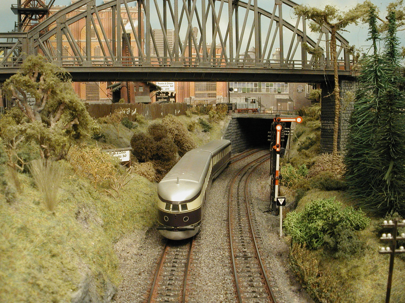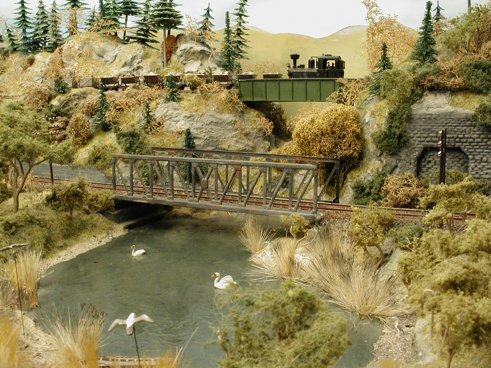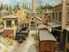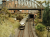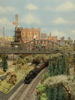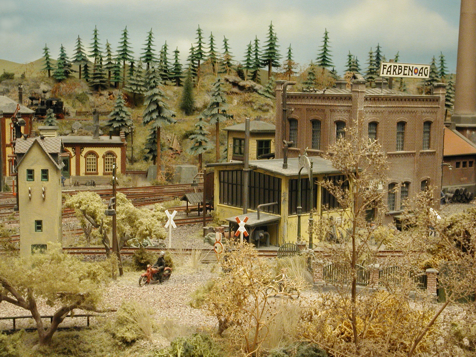 Zechenanlage "Kaiser Wilhelm" Die kleine Zeche "Kaiser Wilhelm II“ mit dem Förderturm ist ein weiterer Blickfang. Die Verladestation der Zeche entstand aus einem Weißmetall-Bausatz (Woodland Scenics) und Kleinteilen aus der "Restekiste". Der Abtransport des schwarzen Goldes erfolgt mit der schmalspurigen Industriebahn. Als Zuglok ist eine HF130C von Bemo im Einsatz. Unterhalb der Bogenbrücke führt die zweigleisige Hauptbahn hindurch. BR 57 2205 (Roco) unterwegs mit einem Güterzug auf der Hauptstrecke. Kurz darauf rauscht der "Fliegende Hamburger“ (Kato) unter der Brücke hindurch... |