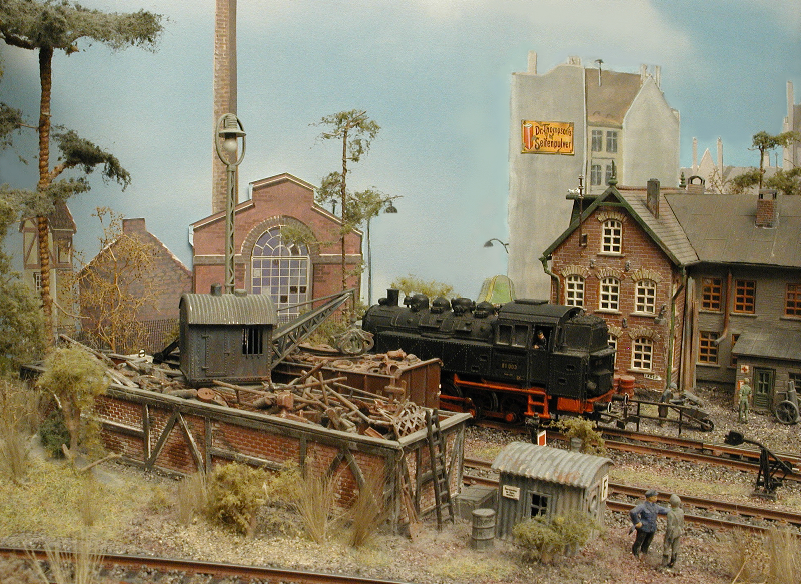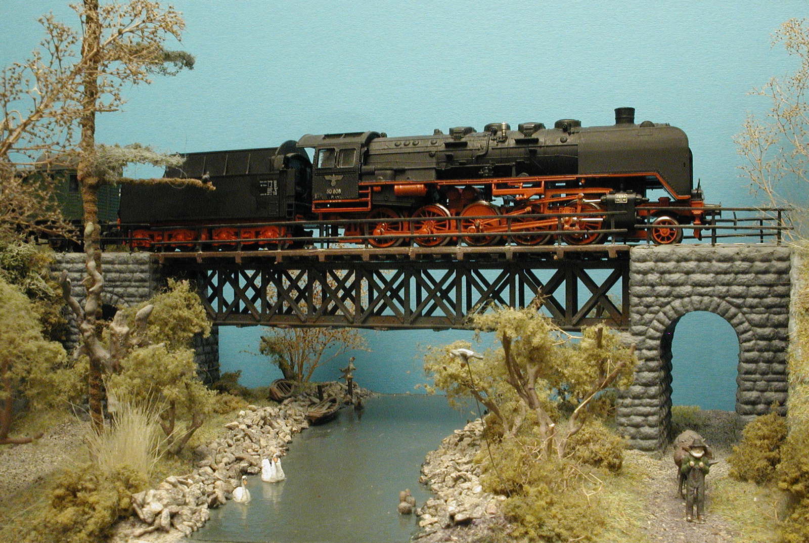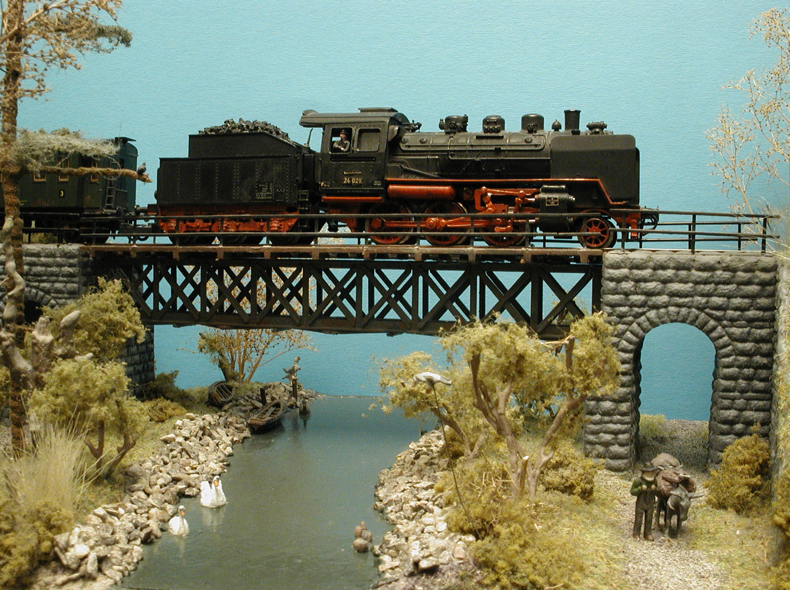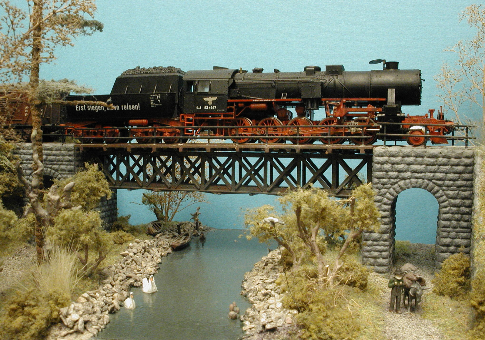 Fotogalerien / Photo galleries Bahnbetriebswerk | Industrie | Nebenstrecke | Bahnhof-Stadt | Rollmaterial | Bilder aus alten Tagen | Die BR 24 029 verlässt den Tunnel bei der Blockstelle 116. Die Baureihe 24 wurde mit Kleinteilen von Weinert und Günther sowie mit einer Ätzbeschriftung optisch verbessert. Nach dem Überqueren der Gitterfachwerkbrücke (Bild 2) führt uns die Strecke vorbei am Bahnbetriebswerk Bromberg Ost mit all seinen Betriebsbauten. DIe BR 50 (Märklin 3319); ein ÖBB-Modell, das sich mit wenigen Handgriffen in eine DRG-Lok umwandeln liess. Der Schrottbansen gehört bereits zu den Bahnbetriebswerk-Anlagen. BR 81 003 wartet auf den Rangierauftrag. Diese Bilder entstanden vor dem Einbau der Brawa Gitterfachwerkbrücke im Jahre 2005. |