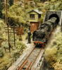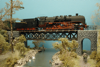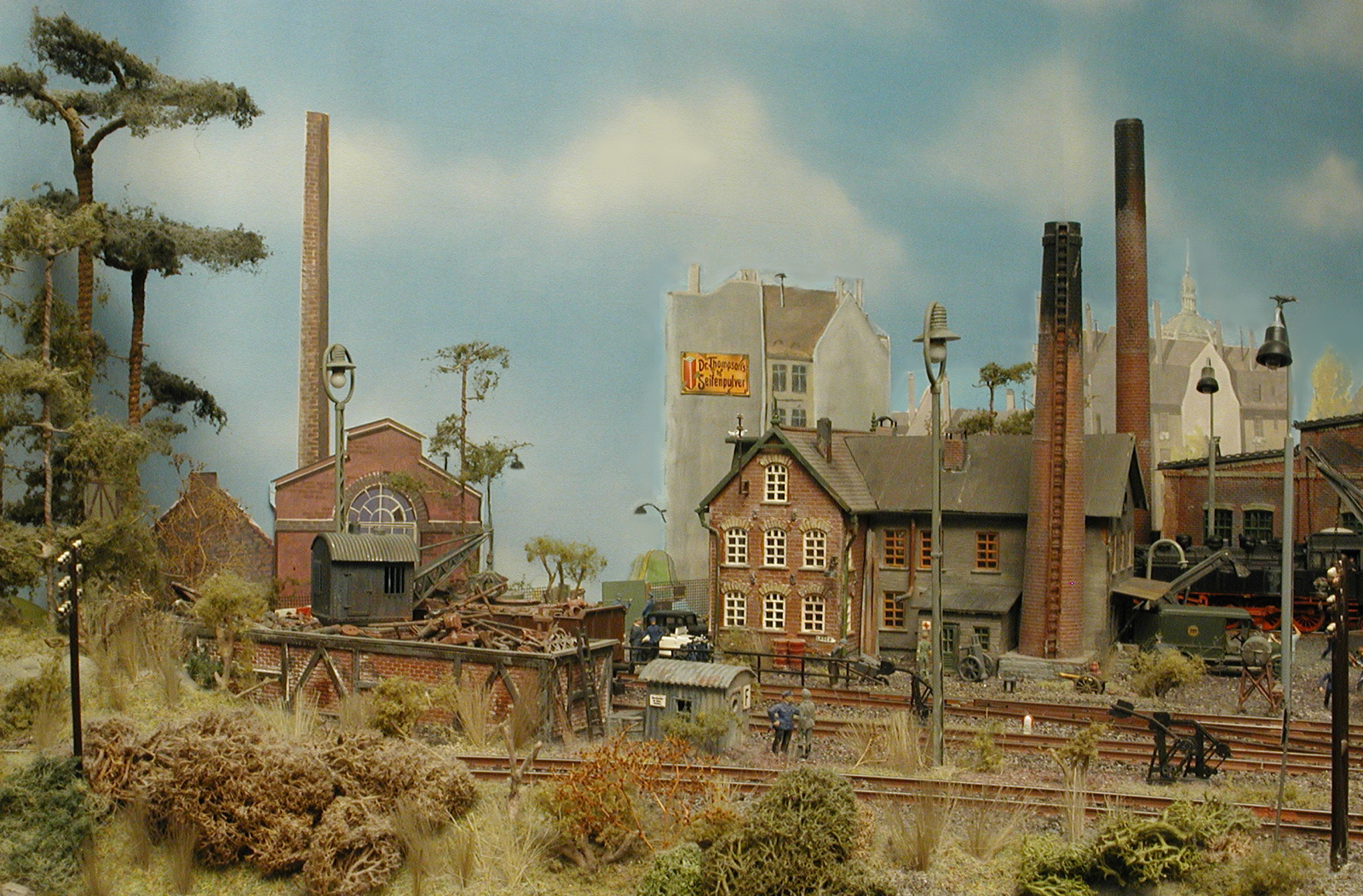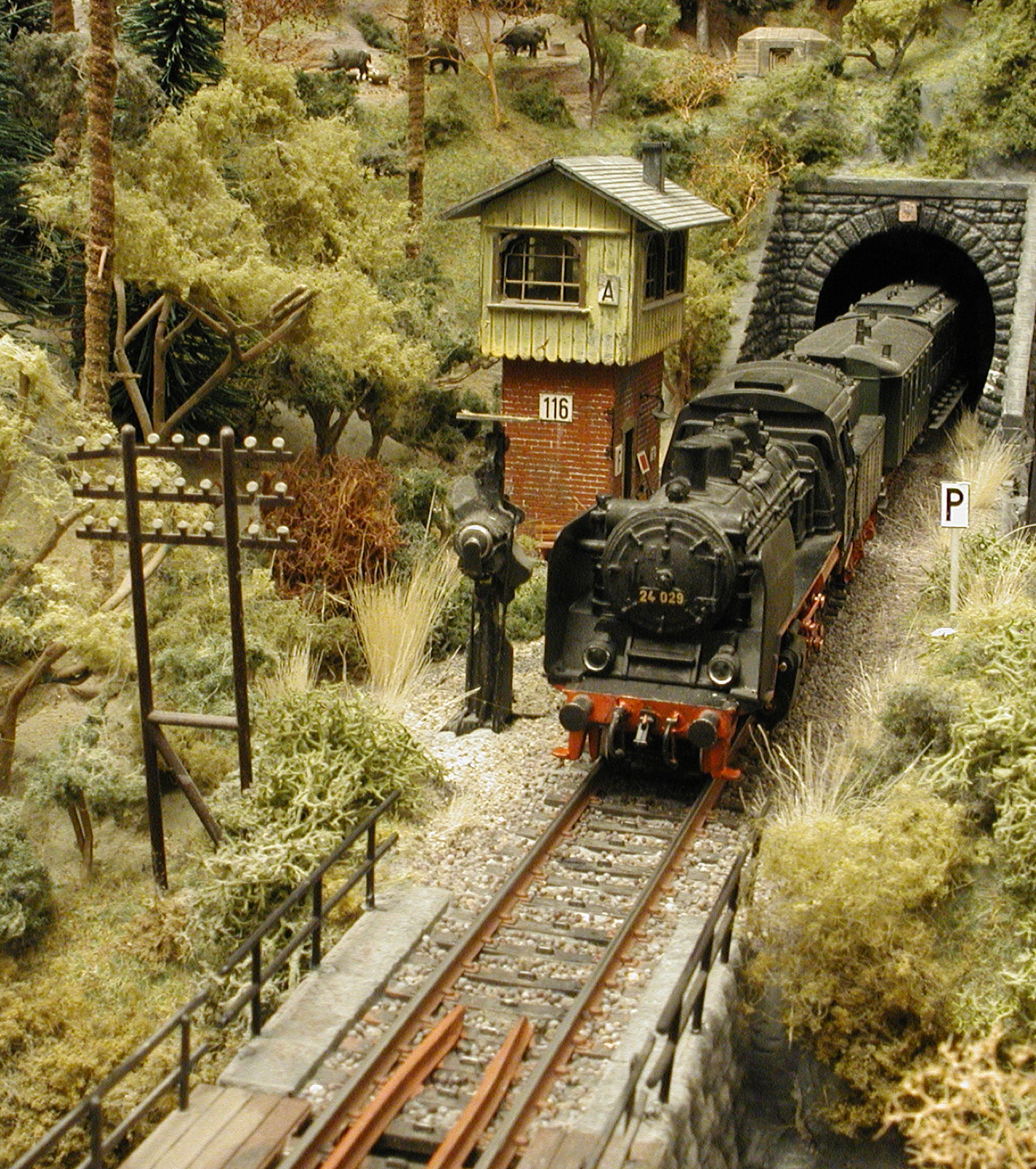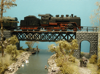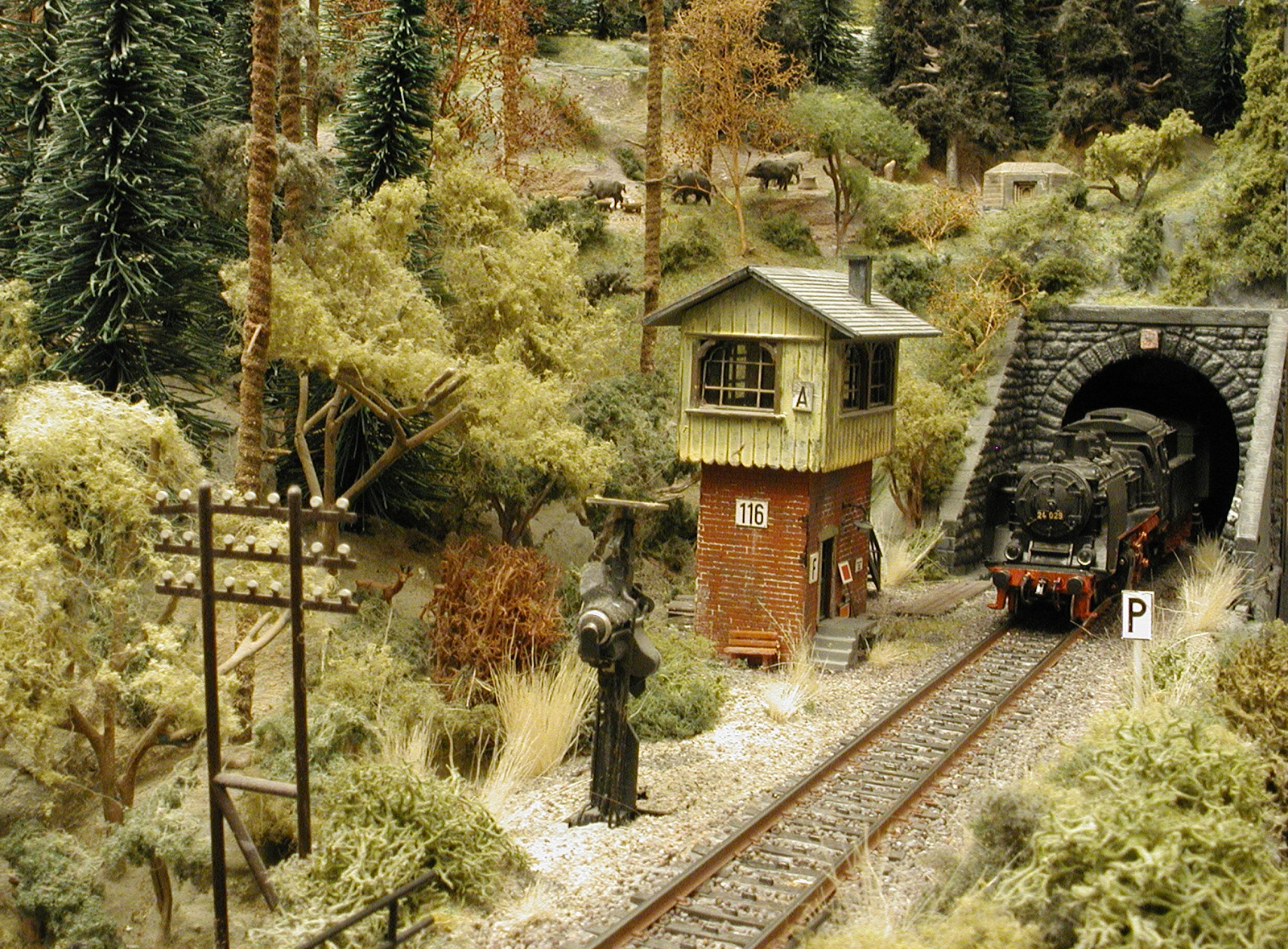 Fotogalerien / Photo galleries Bahnbetriebswerk | Industrie | Nebenstrecke | Bahnhof-Stadt | Rollmaterial | Bilder aus alten Tagen | Die BR 24 029 verlässt den Tunnel bei der Blockstelle 116. Die Baureihe 24 wurde mit Kleinteilen von Weinert und Günther sowie mit einer Ätzbeschriftung optisch verbessert. Nach dem Überqueren der Gitterfachwerkbrücke (Bild 2) führt uns die Strecke vorbei am Bahnbetriebswerk Bromberg Ost mit all seinen Betriebsbauten. DIe BR 50 (Märklin 3319); ein ÖBB-Modell, das sich mit wenigen Handgriffen in eine DRG-Lok umwandeln liess. Der Schrottbansen gehört bereits zu den Bahnbetriebswerk-Anlagen. BR 81 003 wartet auf den Rangierauftrag. Diese Bilder entstanden vor dem Einbau der Brawa Gitterfachwerkbrücke im Jahre 2005. |