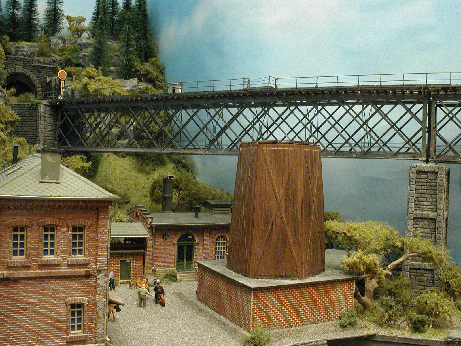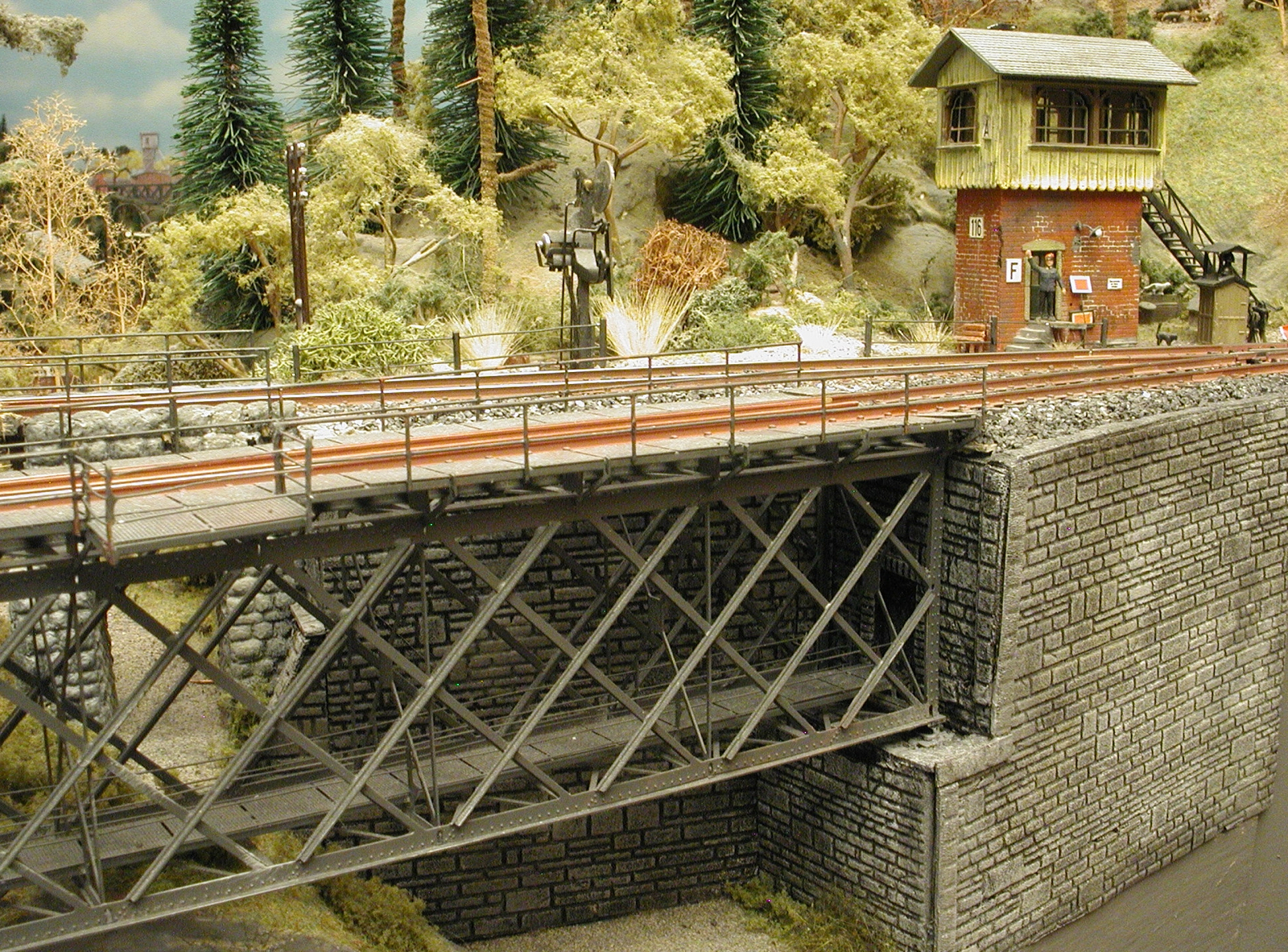 Vor einiger Zeit ersteigerte ich bei Ebay zwei dieser filigranen Brückenbauwerke aus den 70er Jahren. Der Zusammenbau war recht anspruchsvoll, da ich sämtliche Bauteile verlötet habe. Eigentlich war eine Brücke zunächst als Ersatz für die bestehende Pola-Brücke gedacht. Doch schliesslich kam alles anders und ich hatte eine Idee wie sich meine Anlage noch etwas erweitern liess.... - Durch den Einbau einer Weiche konnten die beiden Brawa-Brücken in die Anlage integriert werden.Der Aufwand war relativ gering und hinter der bereits bestehenden Hintergrundkulisse konnte zusätzlich noch ein dreigleisiger Schattenbahnhof einbaut werden. Die neue Strecke dient als so genannte "Kanonenbahn". Die "Pola"-Brücke sowie die beiden Gitterfachwerkbrücken erhielten Brückengeländer aus Metall von Sommerfeldt. Dies ist nun der Anblick, der sich dem Betrachter beim Betreten des "Dienstraums" bietet. |