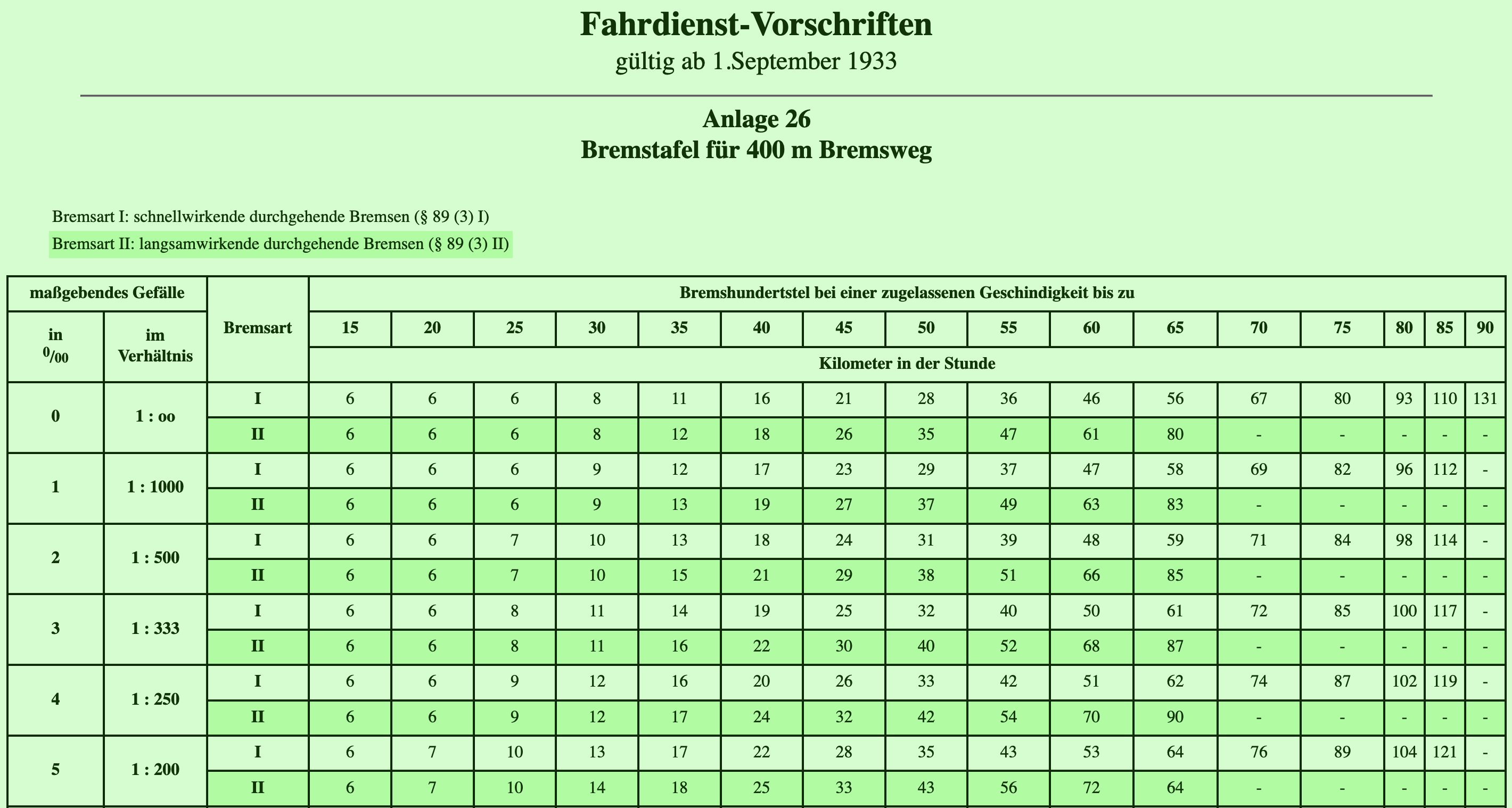 DV 408 Anlage 26 Bremstafel für 400 m Bremsweg (zu § 91 (3))