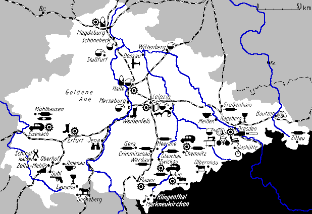 Mit der Entwicklung des Steinkohlenbergbaus im Erzgebirgischen Becken entstand ein Industriegebiet, das vor allem die Eisenverarbeitung und das Textilgewerbe anzog und schließlich zum größten deutschen Textilindustriegebiet heranwuchs. Beispiellos ist die Zahl und Größe der Betriebe; fast jede Rohfaser wird hier verarbeitet; kein Verarbeitungsverfahren ist unbekannt; alle Hilfsgewerbe sind vertreten. Garne, Stoffe, Wirkwaren und Teppiche sind die Haupterzeugnisse. Im Tiefland rief die Braunkohlen- und Kaligewinnung an vielen Stellen eine chemische Großindustrie ins Leben, die in riesenhaften Werkanlagen Luftstickstoff, Kunstdünger und Braunkohlenbenzin erzeugt. Berühmt sind die Leipziger Mustermessen, zu denen alljährlich im Frühjahr und Herbst viele Tausende von Kaufleuten aus aller Welt zusammenkommen, um Geschäfte einzuleiten und abzuschließen.