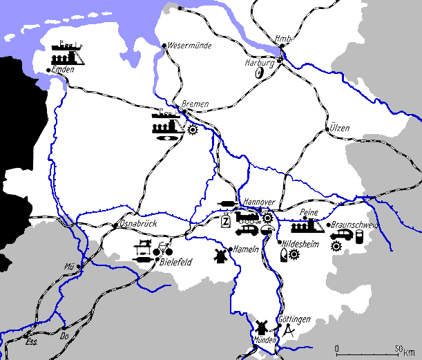 Die Wasserstraßen Niedersachsens sind Zugänge zum Weltmeer. Allerdings ist schon die Weser nicht tief genug, um bei Ebbe ein Absinken der Wasserspiegels von 2 - 3 m zu vertragen. Durch Seeschleusen muß das Abfließen des Wassers verhindert werden, damit der Wasserstand dem Tiefgang der großen Überseedampfer genügt. Der Dortmund-Ems-Kanal ist nicht imstande, mit dem Rhein im Wettbewerb zu treten und den Güterverkehr des Ruhrgebiets zum Weltmarkt an sich zu ziehen; dagegen würde durch den Ausbau des Hansakanals ein Teil dieses Güterverkehrs den leistungsfähigen deutschen Weser- und Elbhäfen zugeführt werden können. Bremen ist der deutsche Woll- und Baumwollmarkt. Es steht an zweiter Stelle im seewärtigen Personen- und Güterverkehr. Harburg beherrscht die Kaliausfuhr.