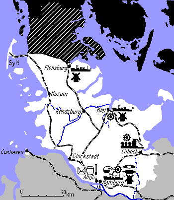Handel und Schiffahrt sind hier für die Küstenbewohner in noch höherem Maße als in Niedersachsen die Grundpfeiler der Wirtschaft. Seewege, Binnenwasserstraßen und Eisenbahnlinien treffen sich in Hamburg. Nach dem Bau des Hansakanals werden alle größeren deutschen Industriegebiete zum Hinterland dieses Hafens gehören. Daraus erklärt sich die einzigartige Stellung Hamburgs i m deutschen Seeverkehr und Seehandel. Von keinem europäischen Festlandshafen wird es im Schiffsverkehr übertroffen. Im Güterumschlag dagegen steht es hinter Rotterdam, weil die Elbe als Zubringerstraße nicht so leistungsfähig wie der Rhein ist.