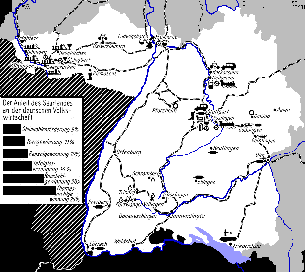 Die Industrie in Baden und der Saarpfalz wird mehr durch die Nähe der Saarkohle und der lothringischen Minette sowie durch die Transportmöglichkeiten auf dem Rhein bestimmt. Mannheim-Ludwigshafen ist ein Schwerpunkt der chemischen Industrie. Im Dreieck Saarbrücken - Saarlautern - Neunkirchen haben wir eins der wichtigsten Gebiete der eisenschaffenden Industrie, dessen Versorgung mit Eisenerz jedoch durch die Abtretung Elsaß-Lothringens gefährdet ist. In Mettlach und Merzig befinden sich die größten Wandplatten und Steingutwerke Europas. Berühmt durch die Herstellung von Goldwaren ist Pforzheim.